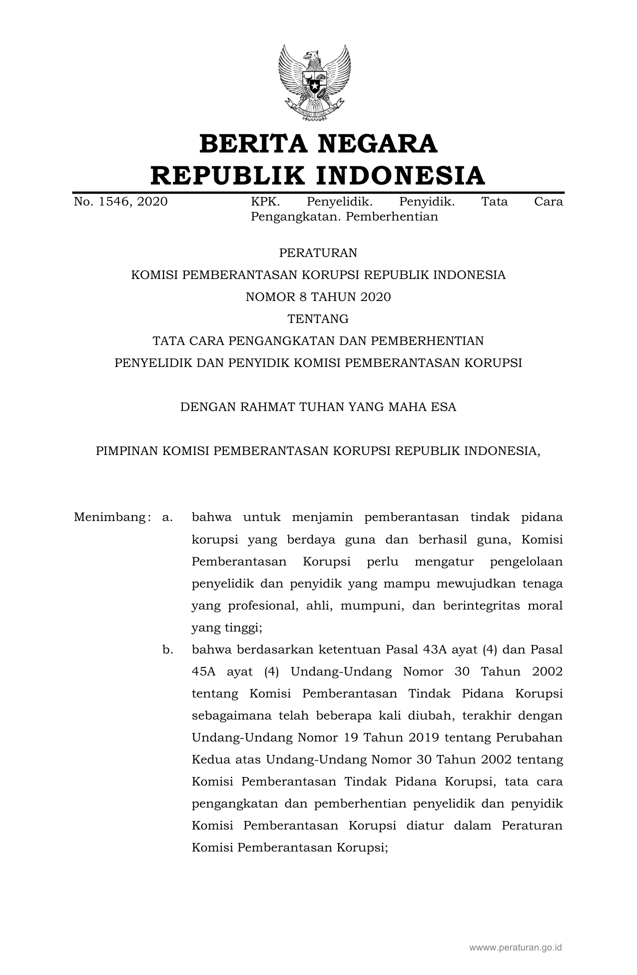 PERBAN Nomor 8 Tahun 2020 | Peraturan Badan Nomor 8 Tahun 2020 tentang TATA CARA PENGANGKATAN DAN PEMBERHENTIAN PENYELIDIK DAN PENYIDIK KOMISI PEMBERANTASAN KORUPSI