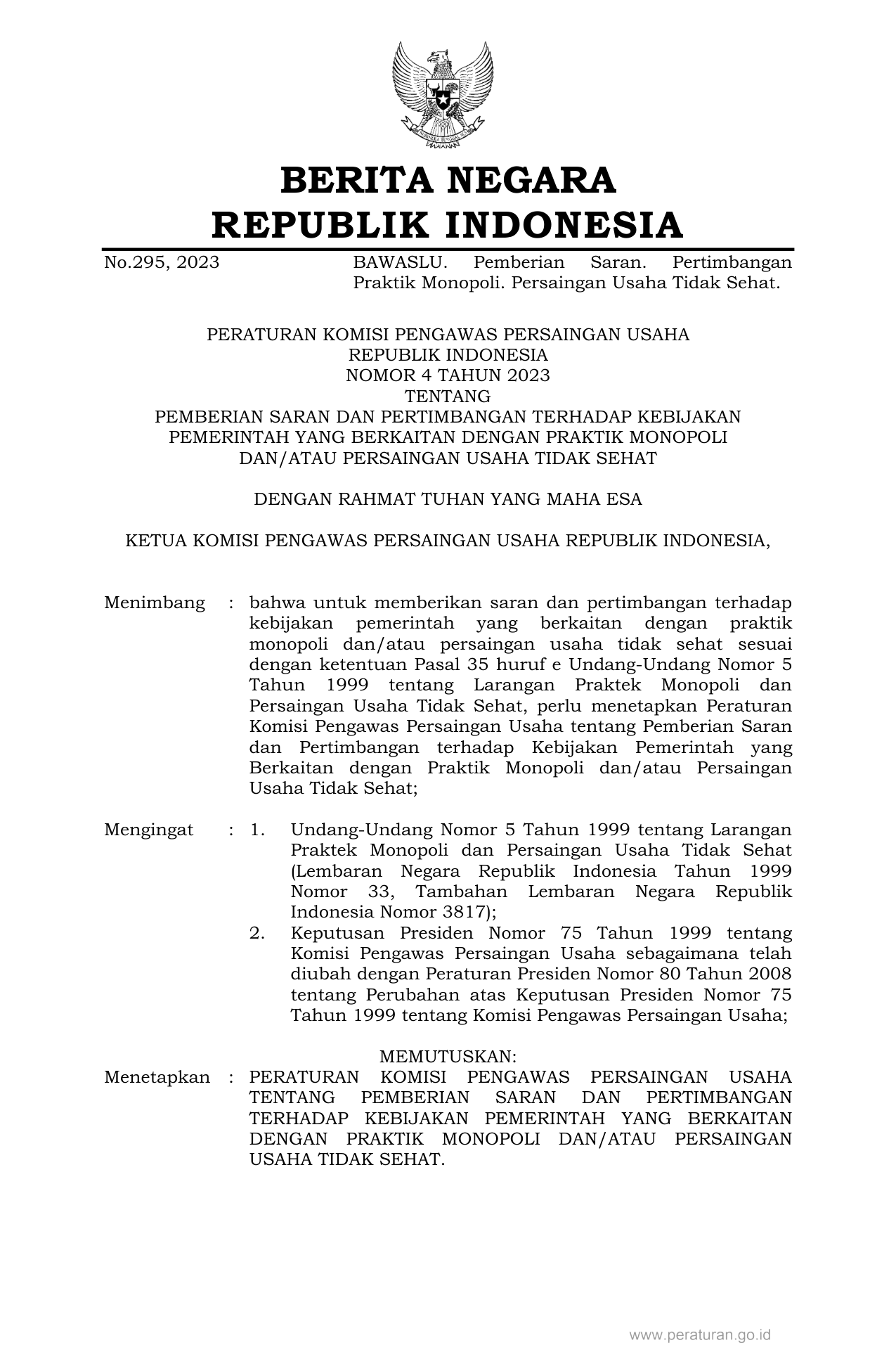 PERBAN Nomor 4 Tahun 2023 | Peraturan Badan Nomor 4 Tahun 2023 tentang PEMBERIAN SARAN DAN PERTIMBANGAN TERHADAP KEBIJAKAN PEMERINTAH YANG BERKAITAN DENGAN PRAKTIK MONOPOLI DAN/ATAU PERSAINGAN USAHA TIDAK SEHAT