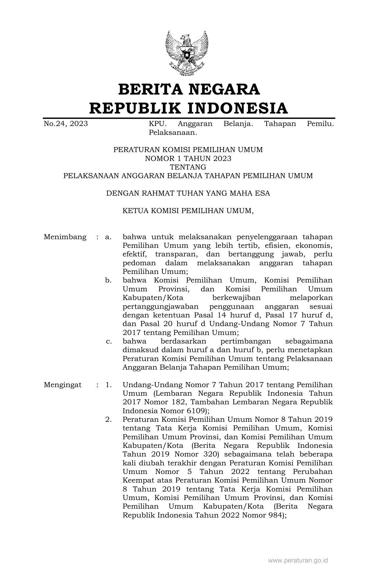PERBAN Nomor 1 Tahun 2023 | Peraturan Badan Nomor 1 Tahun 2023 tentang PELAKSANAAN ANGGARAN BELANJA TAHAPAN PEMILIHAN UMUM