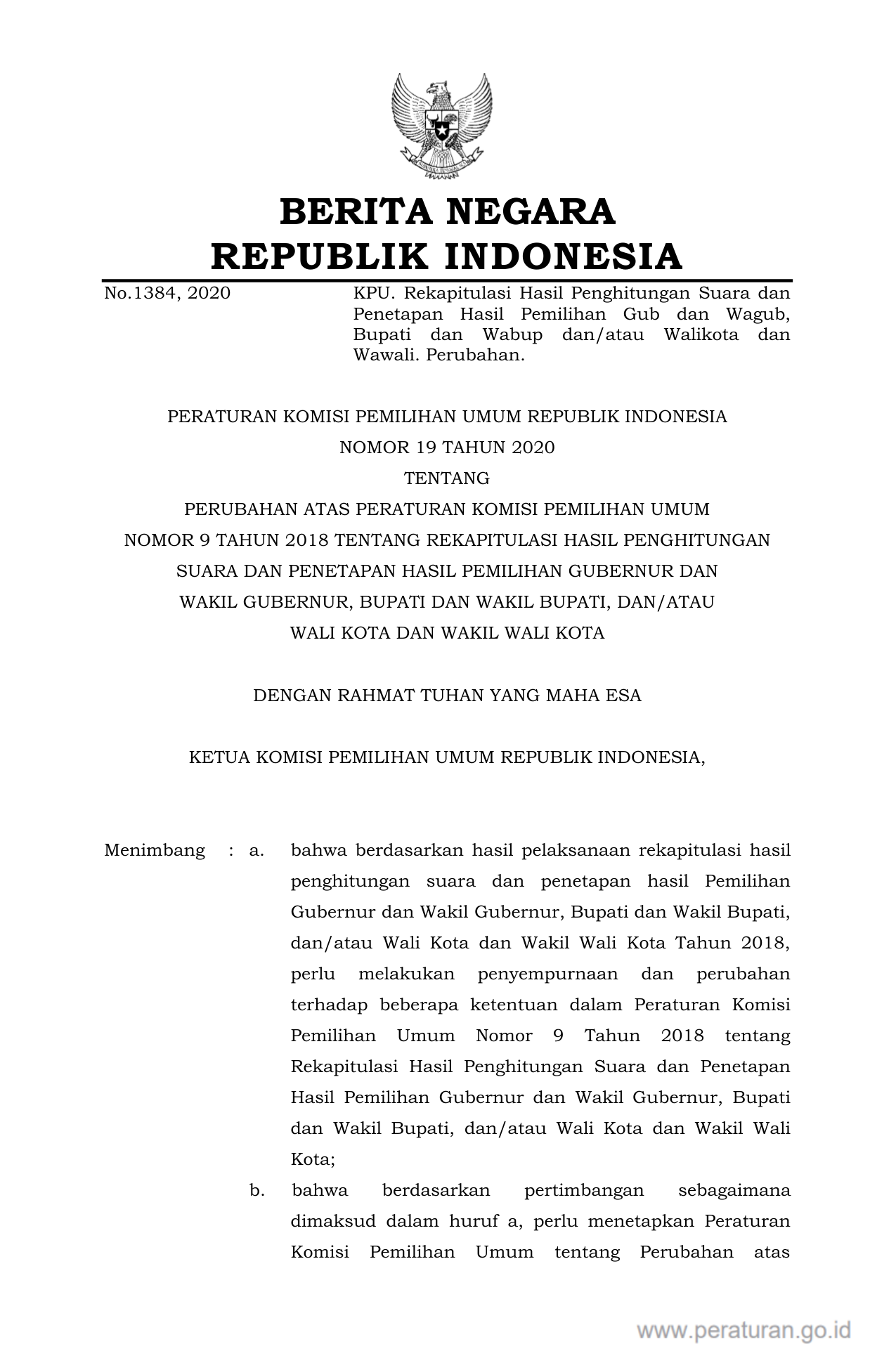 PERBAN Nomor 19 Tahun 2020 | Peraturan Badan Nomor 19 Tahun 2020 tentang PERUBAHAN ATAS PERATURAN KOMISI PEMILIHAN UMUM NOMOR 9 TAHUN 2018 TENTANG REKAPITULASI HASIL PENGHITUNGAN SUARA DAN PENETAPAN HASIL PEMILIHAN GUBERNUR DAN WAKIL GUBERNUR, BUPATI DAN WAKIL BUPATI, DAN/ATAU WALI KOTA DAN WAKIL WALI KOTA
