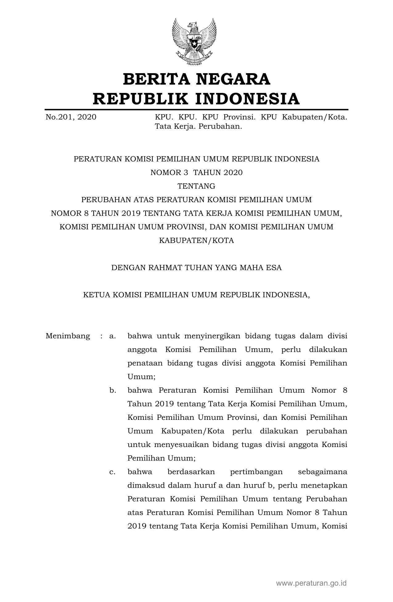 PERBAN Nomor 3 Tahun 2020 | Peraturan Badan Nomor 3 Tahun 2020 tentang PERUBAHAN ATAS PERATURAN KOMISI PEMILIHAN UMUM NOMOR 8 TAHUN 2019 TENTANG TATA KERJA KOMISI PEMILIHAN UMUM, KOMISI PEMILIHAN UMUM PROVINSI, DAN KOMISI PEMILIHAN UMUM KABUPATEN/KOTA
