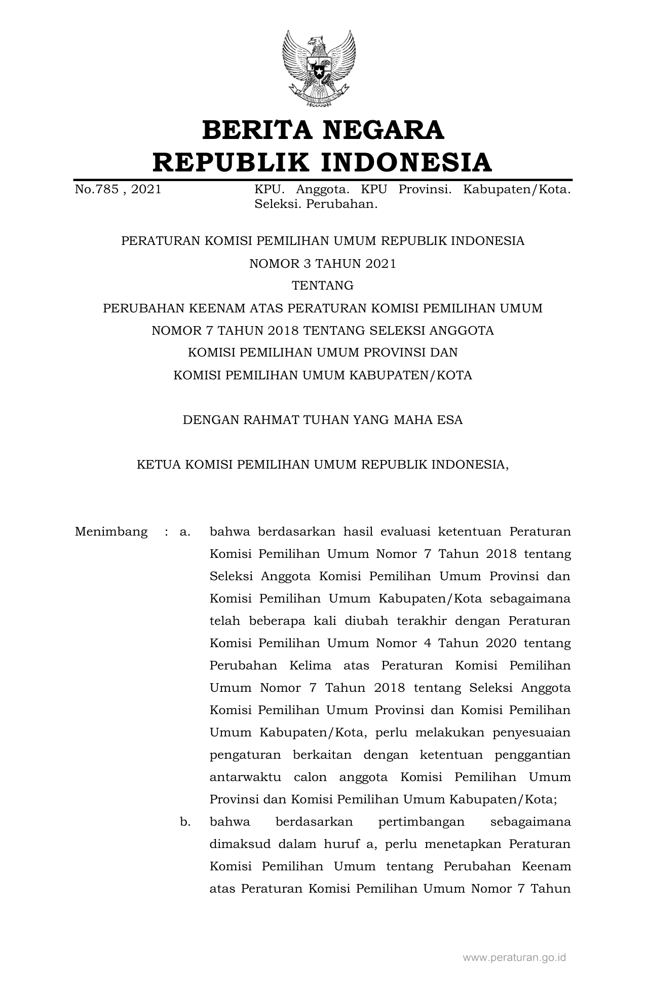 PERBAN Nomor 3 Tahun 2021 | Peraturan Badan Nomor 3 Tahun 2021 tentang PERUBAHAN KEENAM ATAS PERATURAN KOMISI PEMILIHAN UMUM NOMOR 7 TAHUN 2018 TENTANG SELEKSI ANGGOTA KOMISI PEMILIHAN UMUM PROVINSI DAN KOMISI PEMILIHAN UMUM KABUPATEN/KOTA
