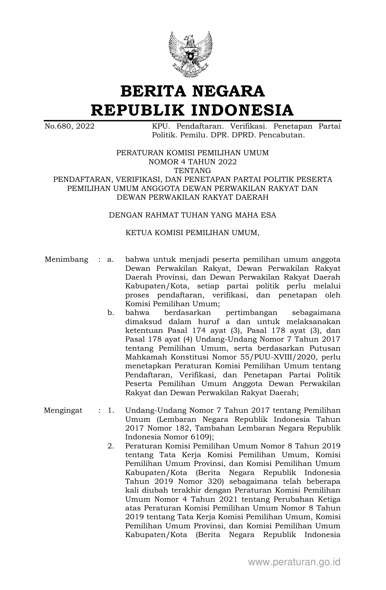PERBAN Nomor 4 Tahun 2022 | Peraturan Badan Nomor 4 Tahun 2022 tentang PENDAFTARAN, VERIFIKASI, DAN PENETAPAN PARTAI POLITIK PESERTA PEMILIHAN UMUM ANGGOTA DEWAN PERWAKILAN RAKYAT DAN DEWAN PERWAKILAN RAKYAT DAERAH