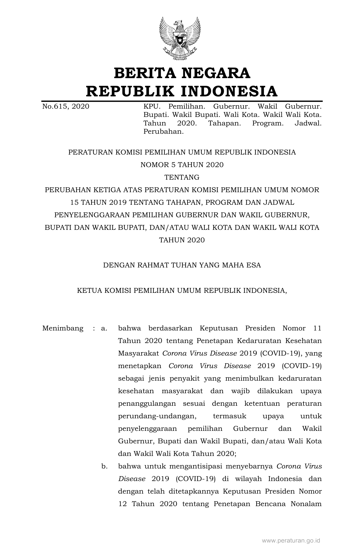 PERBAN Nomor 5 Tahun 2020 | Peraturan Badan Nomor 5 Tahun 2020 tentang PERUBAHAN KETIGA ATAS PERATURAN KOMISI PEMILIHAN UMUM NOMOR 15 TAHUN 2019 TENTANG TAHAPAN, PROGRAM DAN JADWAL PENYELENGGARAAN PEMILIHAN GUBERNUR DAN WAKIL GUBERNUR, BUPATI DAN WAKIL BUPATI, DAN/ATAU WALI KOTA DAN WAKIL WALI KOTA TAHUN 2020