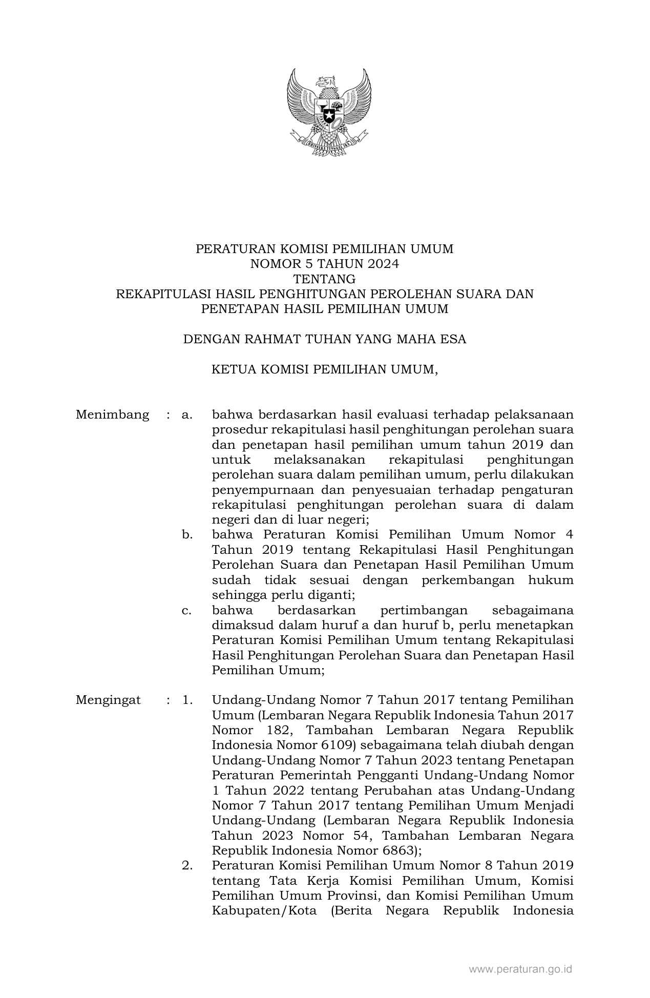 PERBAN Nomor 5 Tahun 2024 | Peraturan Badan Nomor 5 Tahun 2024 tentang REKAPITULASI HASIL PENGHITUNGAN PEROLEHAN SUARA DAN PENETAPAN HASIL PEMILIHAN UMUM