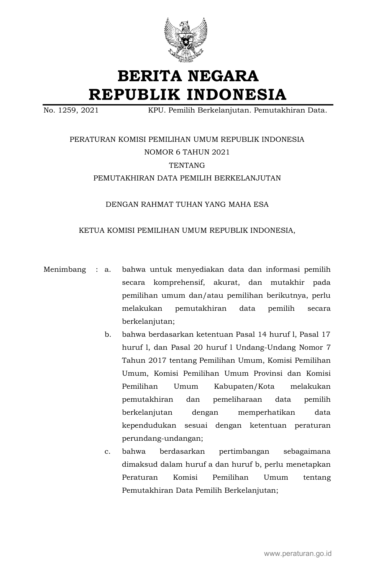 PERBAN Nomor 6 Tahun 2021 | Peraturan Badan Nomor 6 Tahun 2021 tentang PEMUTAKHIRAN DATA PEMILIH BERKELANJUTAN