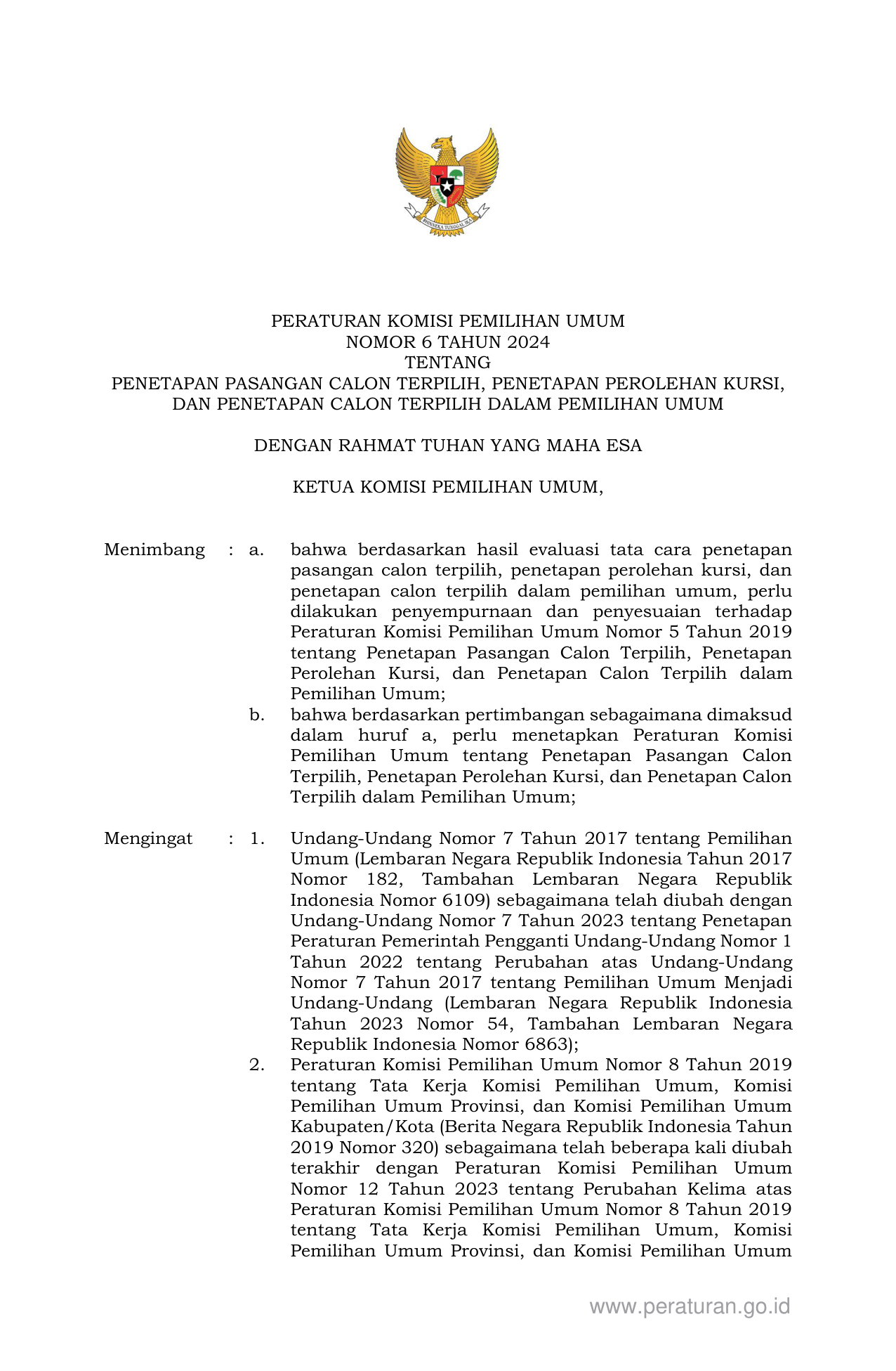 PERBAN Nomor 6 Tahun 2024 | Peraturan Badan Nomor 6 Tahun 2024 tentang PENETAPAN PASANGAN CALON TERPILIH, PENETAPAN PEROLEHAN KURSI, DAN PENETAPAN CALON TERPILIH DALAM PEMILIHAN UMUM