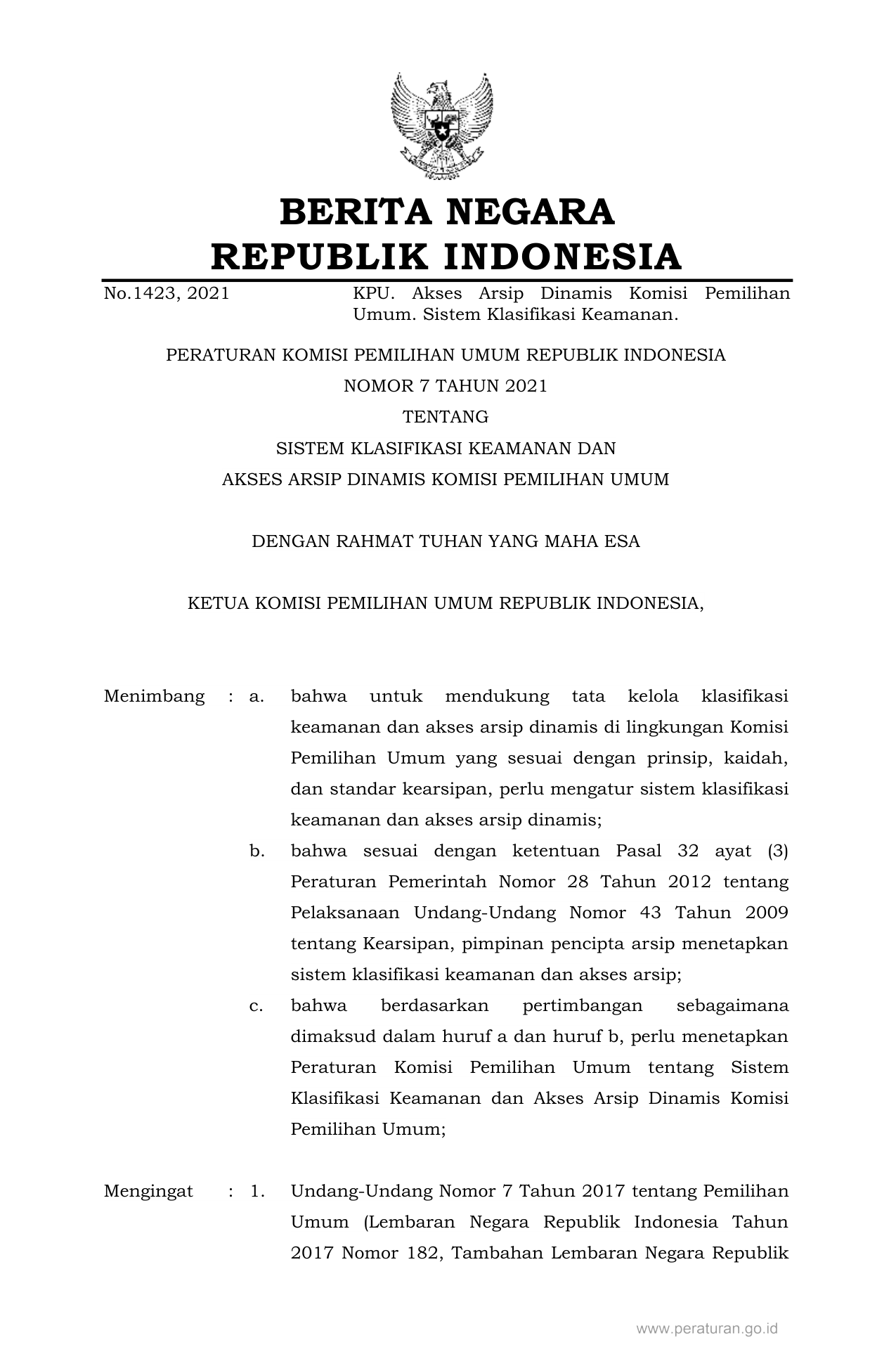 PERBAN Nomor 7 Tahun 2021 | Peraturan Badan Nomor 7 Tahun 2021 tentang SISTEM KLASIFIKASI KEAMANAN DAN AKSES ARSIP DINAMIS KOMISI PEMILIHAN UMUM