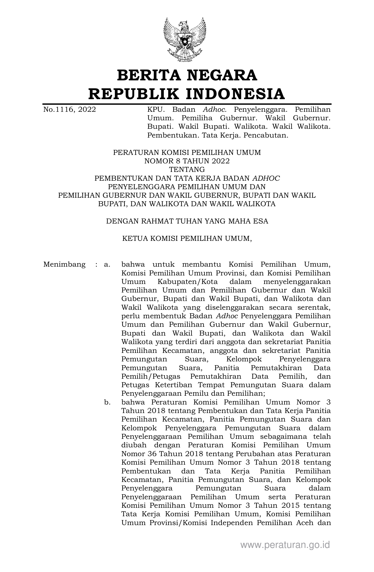 PERBAN Nomor 8 Tahun 2022 | Peraturan Badan Nomor 8 Tahun 2022 tentang PEMBENTUKAN DAN TATA KERJA BADAN ADHOC PENYELENGGARA PEMILIHAN UMUM DANPEMILIHAN GUBERNUR DAN WAKIL GUBERNUR, BUPATI DAN WAKIL BUPATI, DAN WALIKOTA DAN WAKIL WALIKOTA