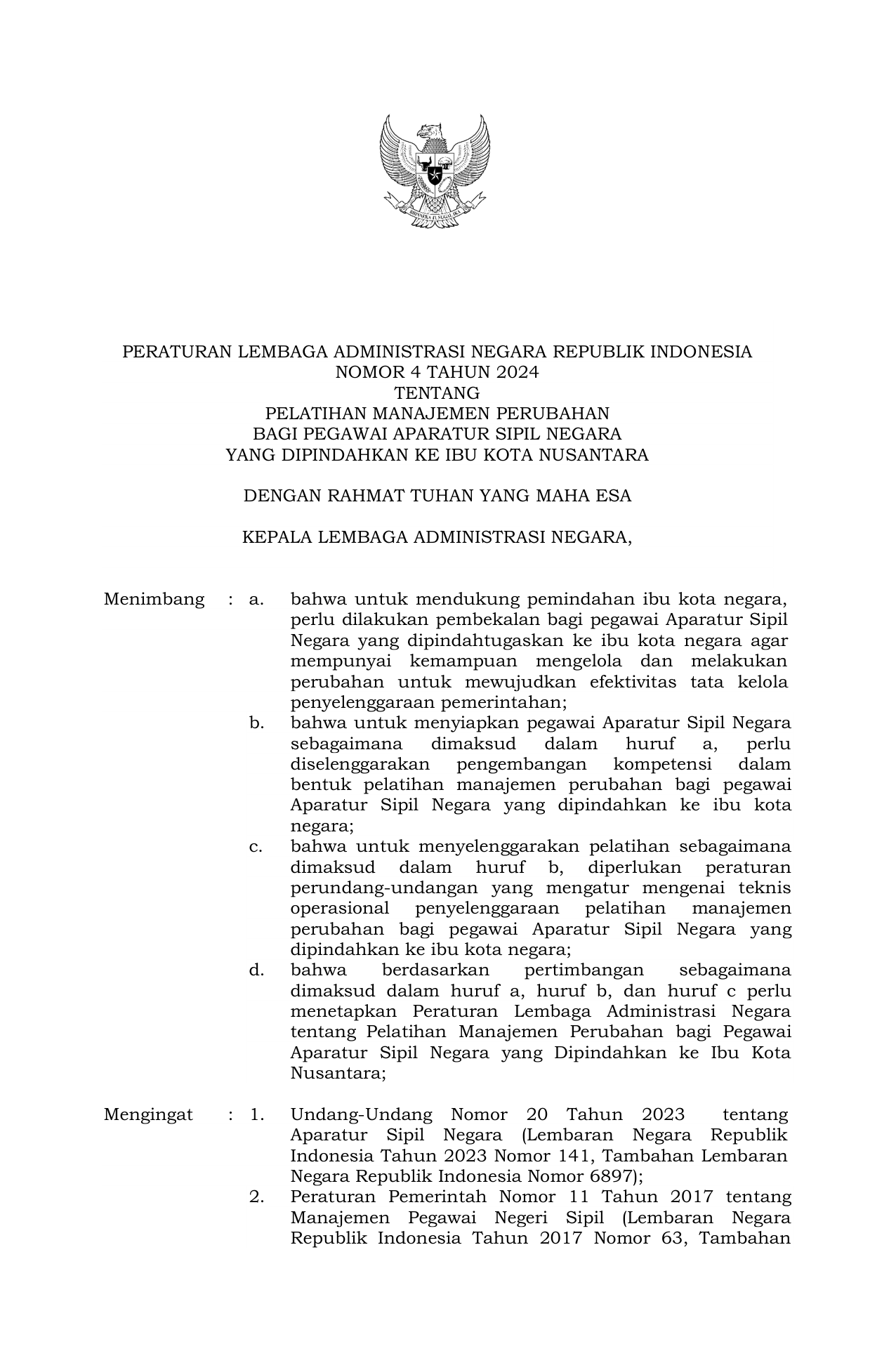 PERBAN Nomor 4 Tahun 2024 | Peraturan Badan Nomor 4 Tahun 2024 tentang Pelatihan Manajemen Perubahan bagi Pegawai Aparatur Sipil Negara yang Dipindahkan ke Ibu Kota Nusantara
