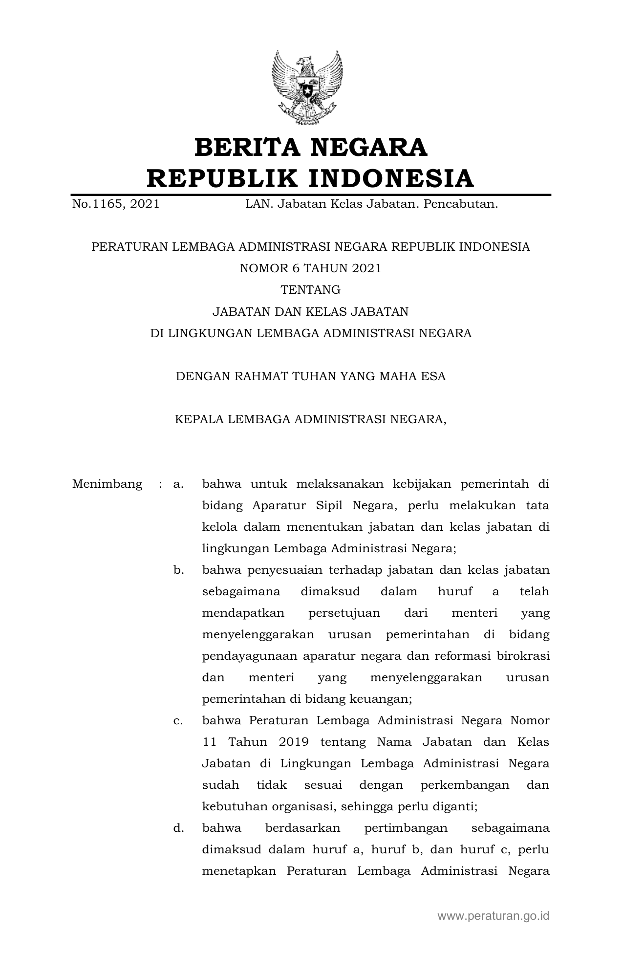 PERBAN Nomor 6 Tahun 2021 | Peraturan Badan Nomor 6 Tahun 2021 tentang JABATAN DAN KELAS JABATAN DI LINGKUNGAN LEMBAGA ADMINISTRASI NEGARA