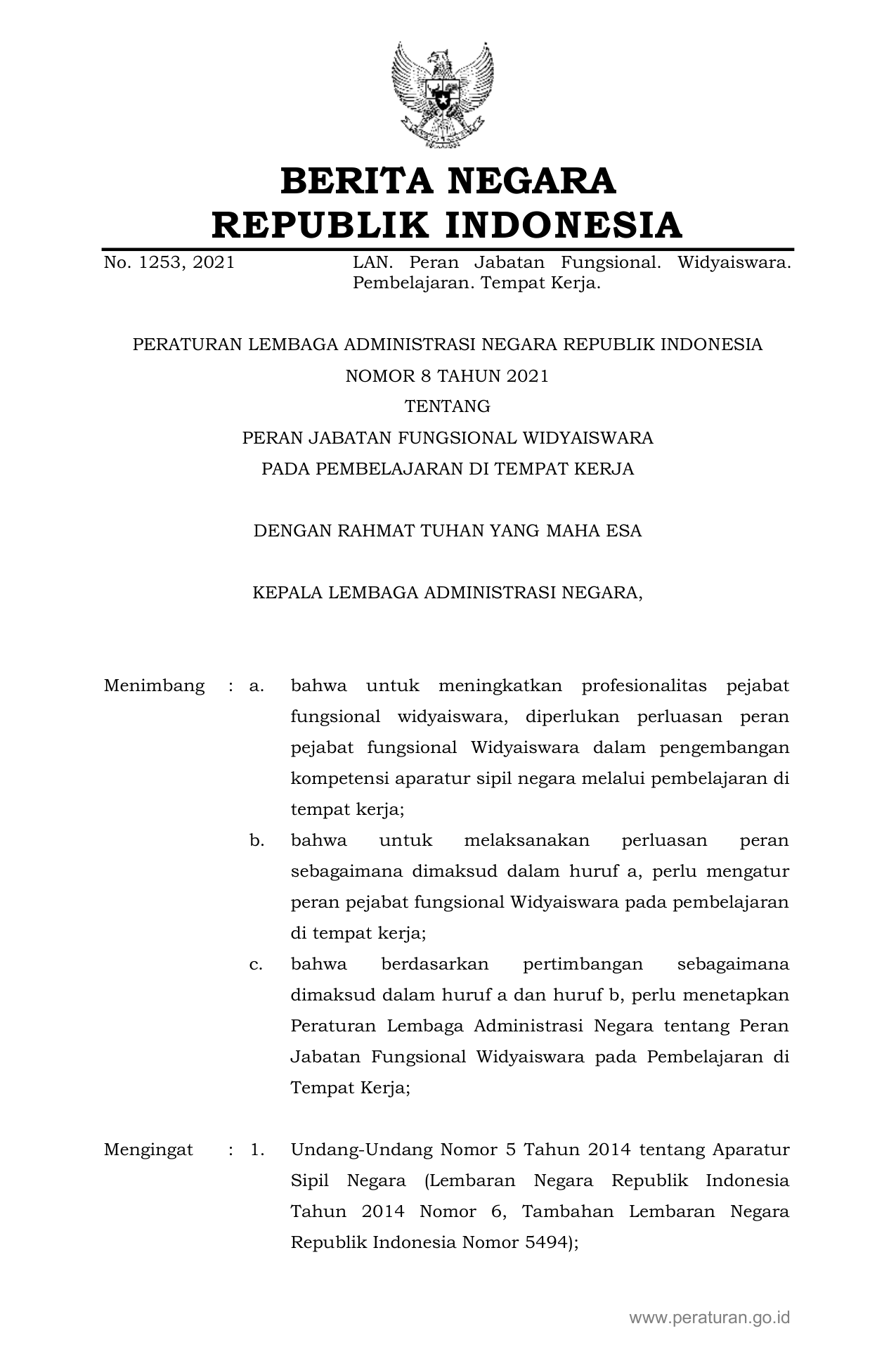PERBAN Nomor 8 Tahun 2021 | Peraturan Badan Nomor 8 Tahun 2021 tentang PERAN JABATAN FUNGSIONAL WIDYAISWARA PADA PEMBELAJARAN DI TEMPAT KERJA