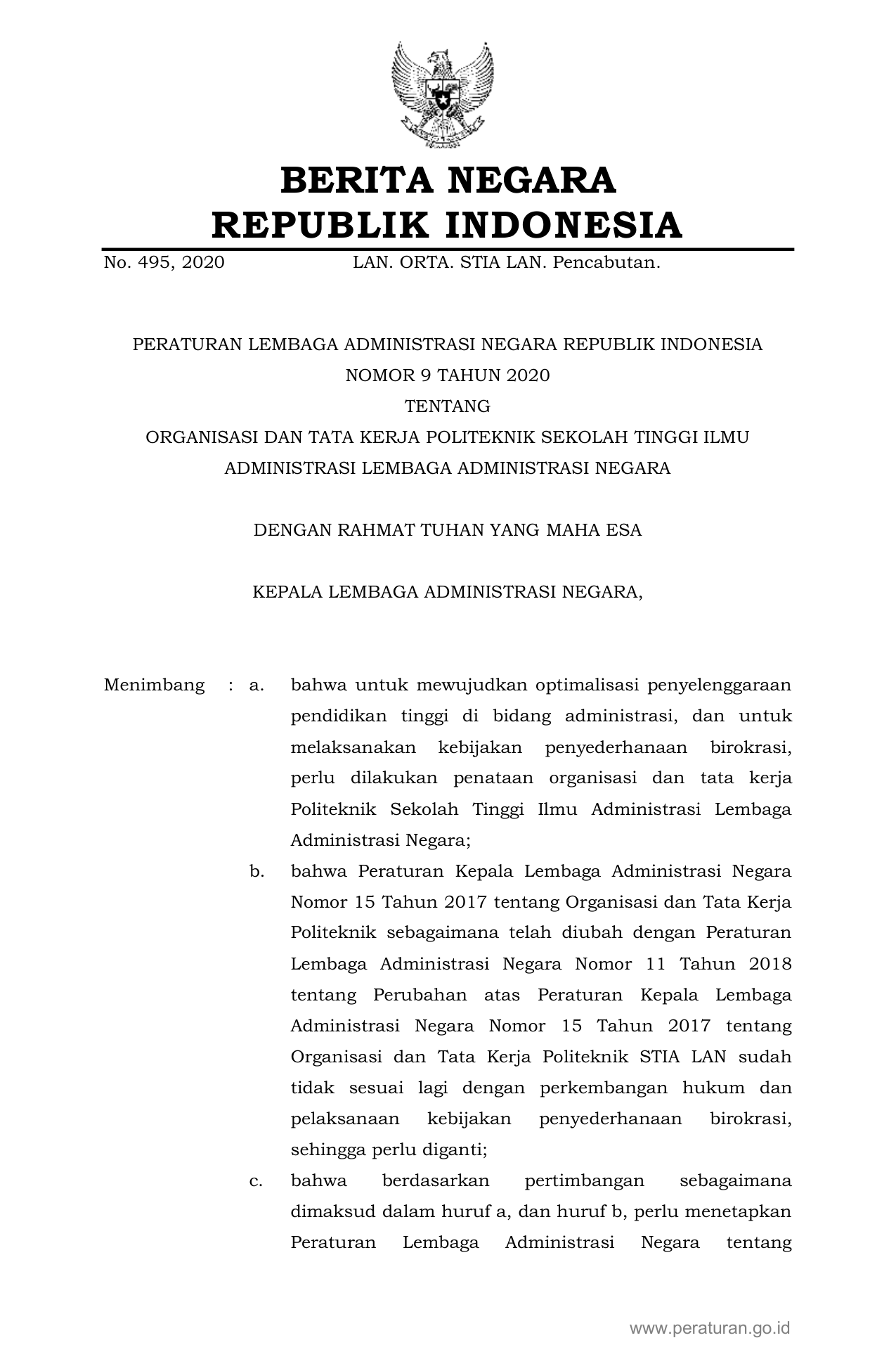 PERBAN Nomor 9 Tahun 2020 | Peraturan Badan Nomor 9 Tahun 2020 tentang ORGANISASI DAN TATA KERJA POLITEKNIK SEKOLAH TINGGI ILMU ADMINISTRASI LEMBAGA ADMINISTRASI NEGARA