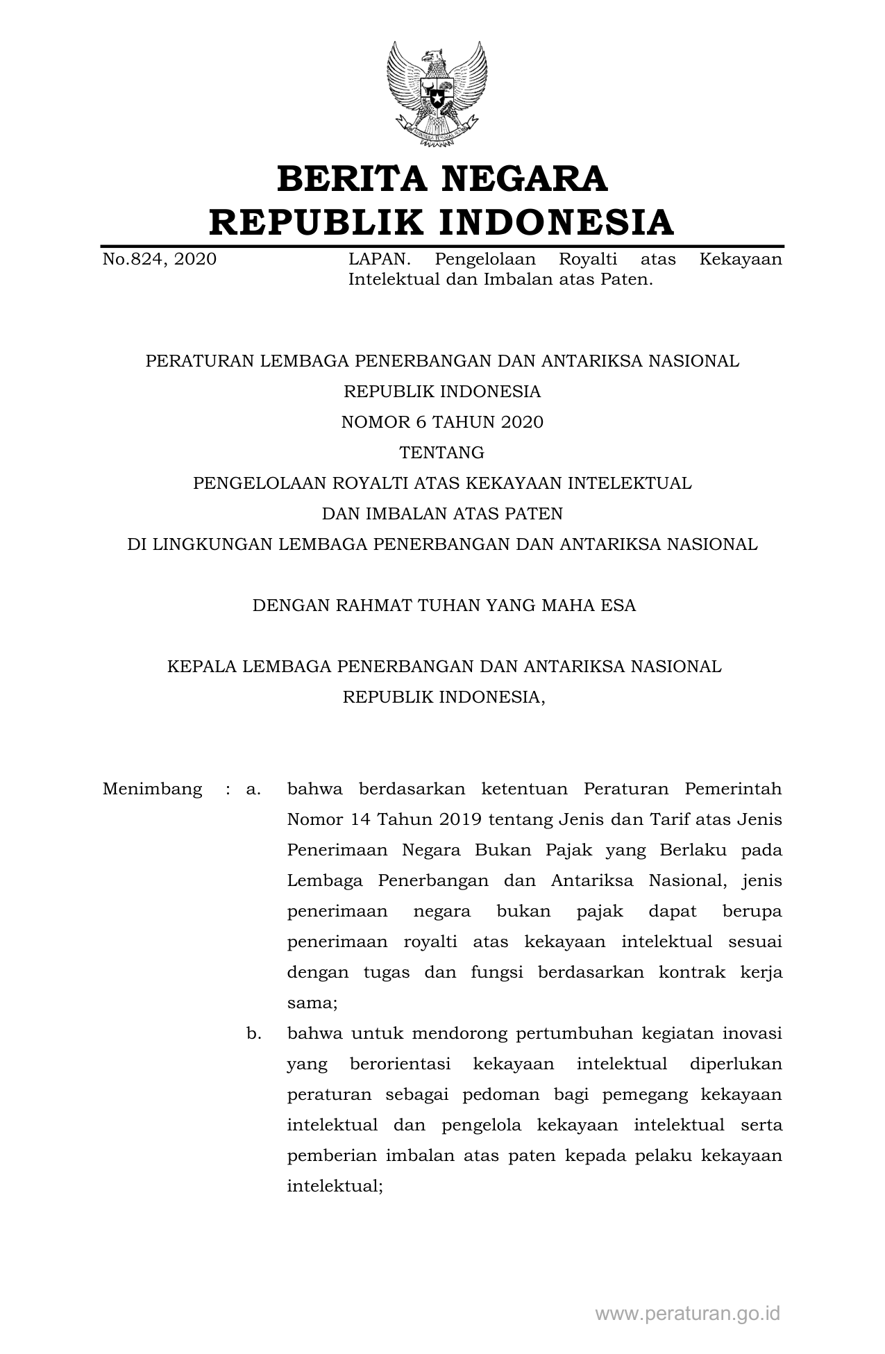 PERBAN Nomor 6 Tahun 2020 | Peraturan Badan Nomor 6 Tahun 2020 tentang PENGELOLAAN ROYALTI ATAS KEKAYAAN INTELEKTUAL DAN IMBALAN ATAS PATEN DI LINGKUNGAN LEMBAGA PENERBANGAN DAN ANTARIKSA NASIONAL