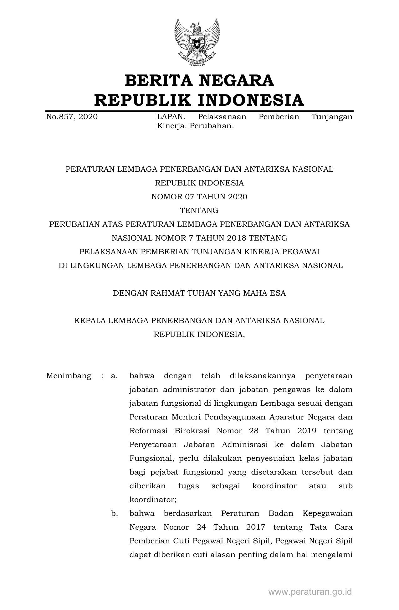 PERBAN Nomor 7 Tahun 2020 | Peraturan Badan Nomor 7 Tahun 2020 tentang PERUBAHAN ATAS PERATURAN LEMBAGA PENERBANGAN DAN ANTARIKSA NASIONAL NOMOR 7 TAHUN 2018 TENTANG PELAKSANAAN PEMBERIAN TUNJANGAN KINERJA PEGAWAI DI LINGKUNGAN LEMBAGA PENERBANGAN DAN ANTARIKSA NASIONAL