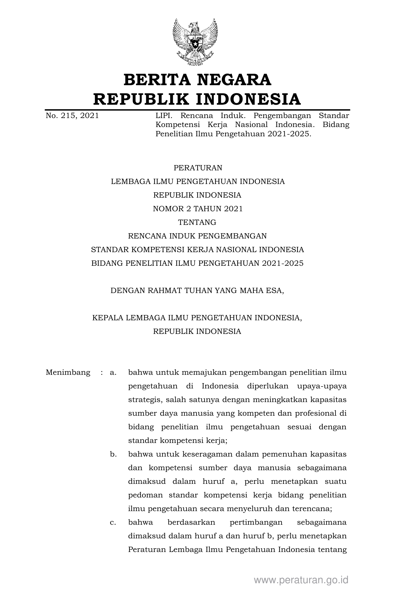 PERBAN Nomor 2 Tahun 2021 | Peraturan Badan Nomor 2 Tahun 2021 tentang RENCANA INDUK PENGEMBANGAN STANDAR KOMPETENSI KERJA NASIONAL INDONESIA BIDANG PENELITIAN ILMU PENGETAHUAN 2021-2025