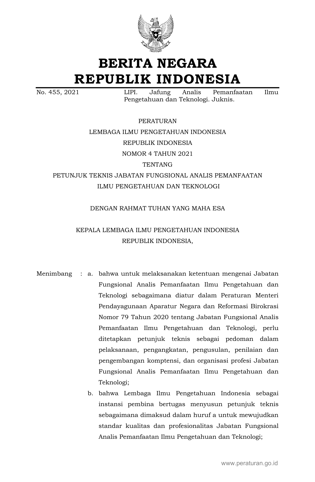 PERBAN Nomor 4 Tahun 2021 | Peraturan Badan Nomor 4 Tahun 2021 tentang PETUNJUK TEKNIS JABATAN FUNGSIONAL ANALIS PEMANFAATAN ILMU PENGETAHUAN DAN TEKNOLOGI