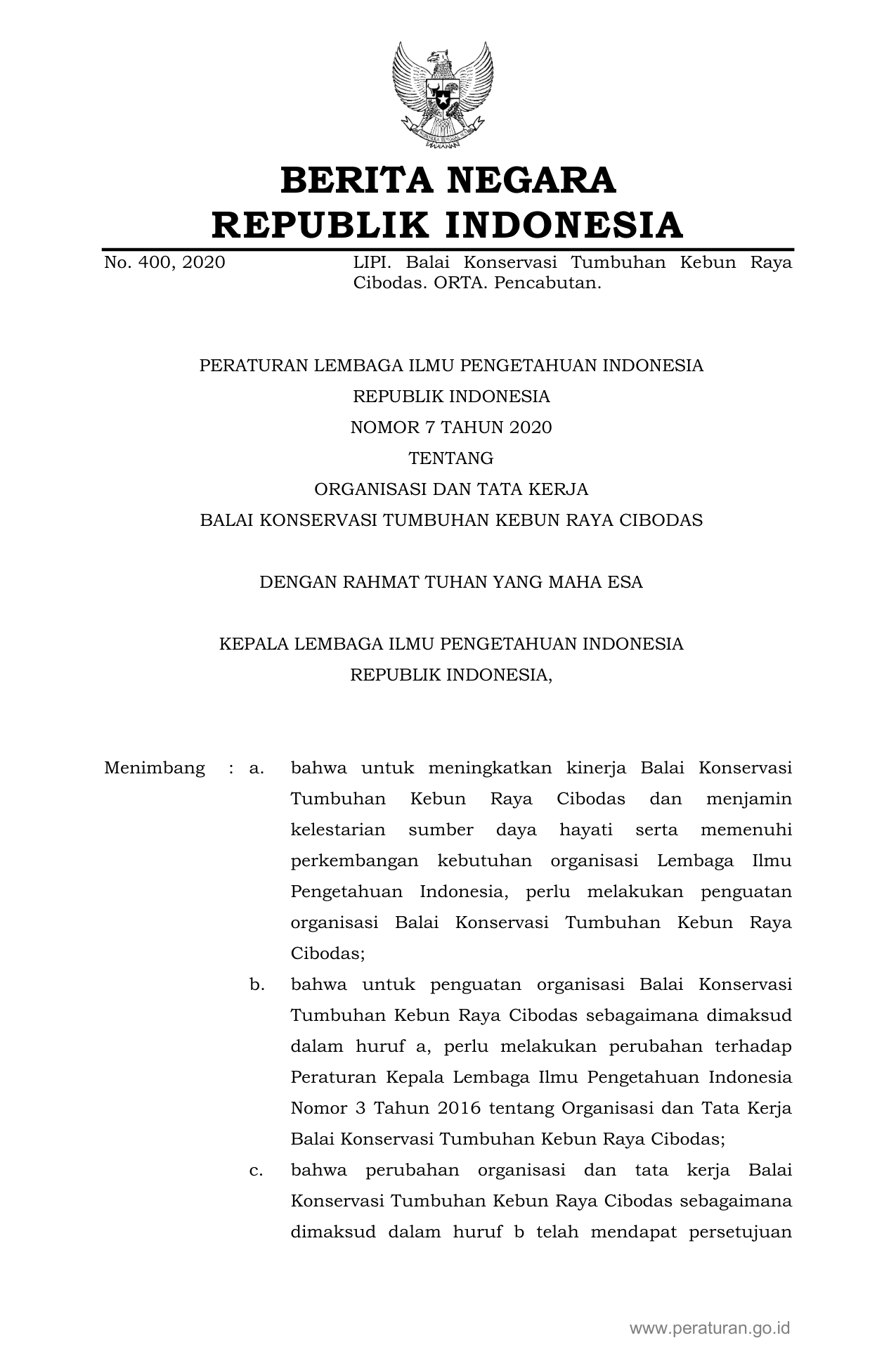 PERBAN Nomor 7 Tahun 2020 | Peraturan Badan Nomor 7 Tahun 2020 tentang ORGANISASI DAN TATA KERJA BALAI KONSERVASI TUMBUHAN KEBUN RAYA CIBODAS