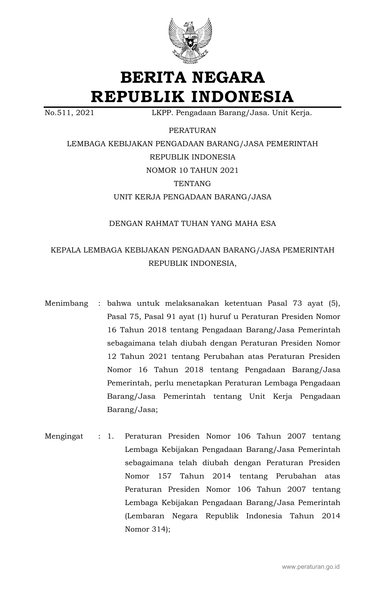PERBAN Nomor 10 Tahun 2021 | Peraturan Badan Nomor 10 Tahun 2021 tentang UNIT KERJA PENGADAAN BARANG/JASA