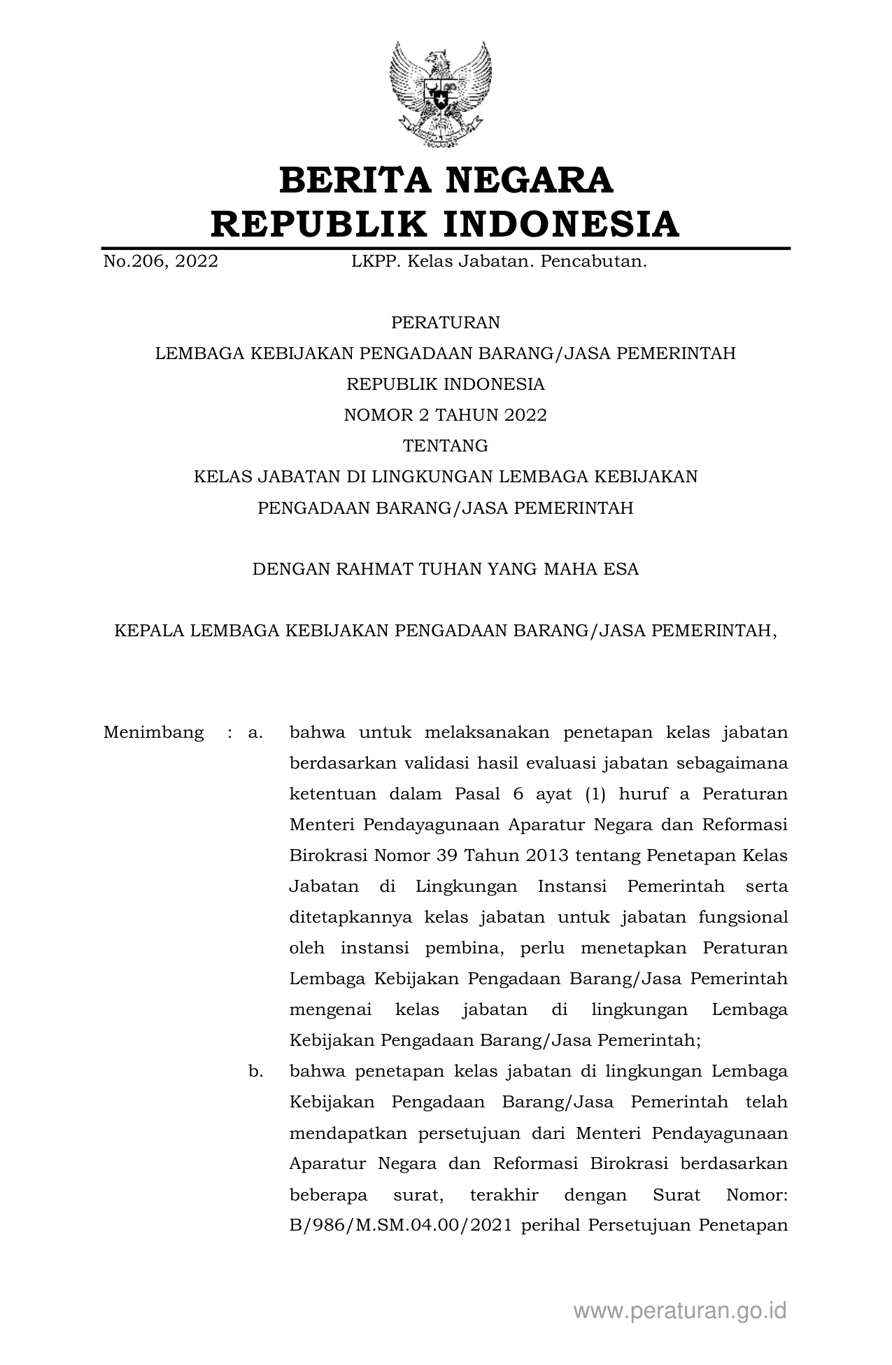 PERBAN Nomor 2 Tahun 2022 | Peraturan Badan Nomor 2 Tahun 2022 tentang KELAS JABATAN DI LINGKUNGAN LEMBAGA KEBIJAKAN PENGADAAN BARANG/JASA PEMERINTAH