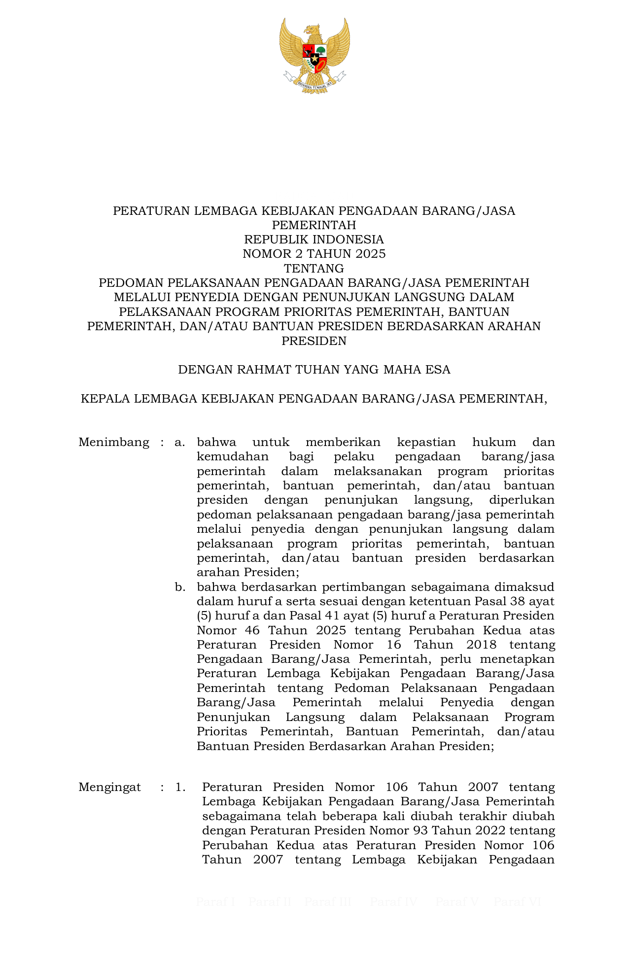 PERBAN Nomor 2 Tahun 2025 | Peraturan Badan Nomor 2 Tahun 2025 tentang Pedoman Pelaksanaan Pengadaan Barang Jasa Pemerintah Melalui Penyedia Dengan Penunjukan Langsung Dalam Pelaksanaan Program Prioritas Pemerintah Bantuan Pemerintah dan atau Bantuan Presiden Berdasarkan Arahan Presiden