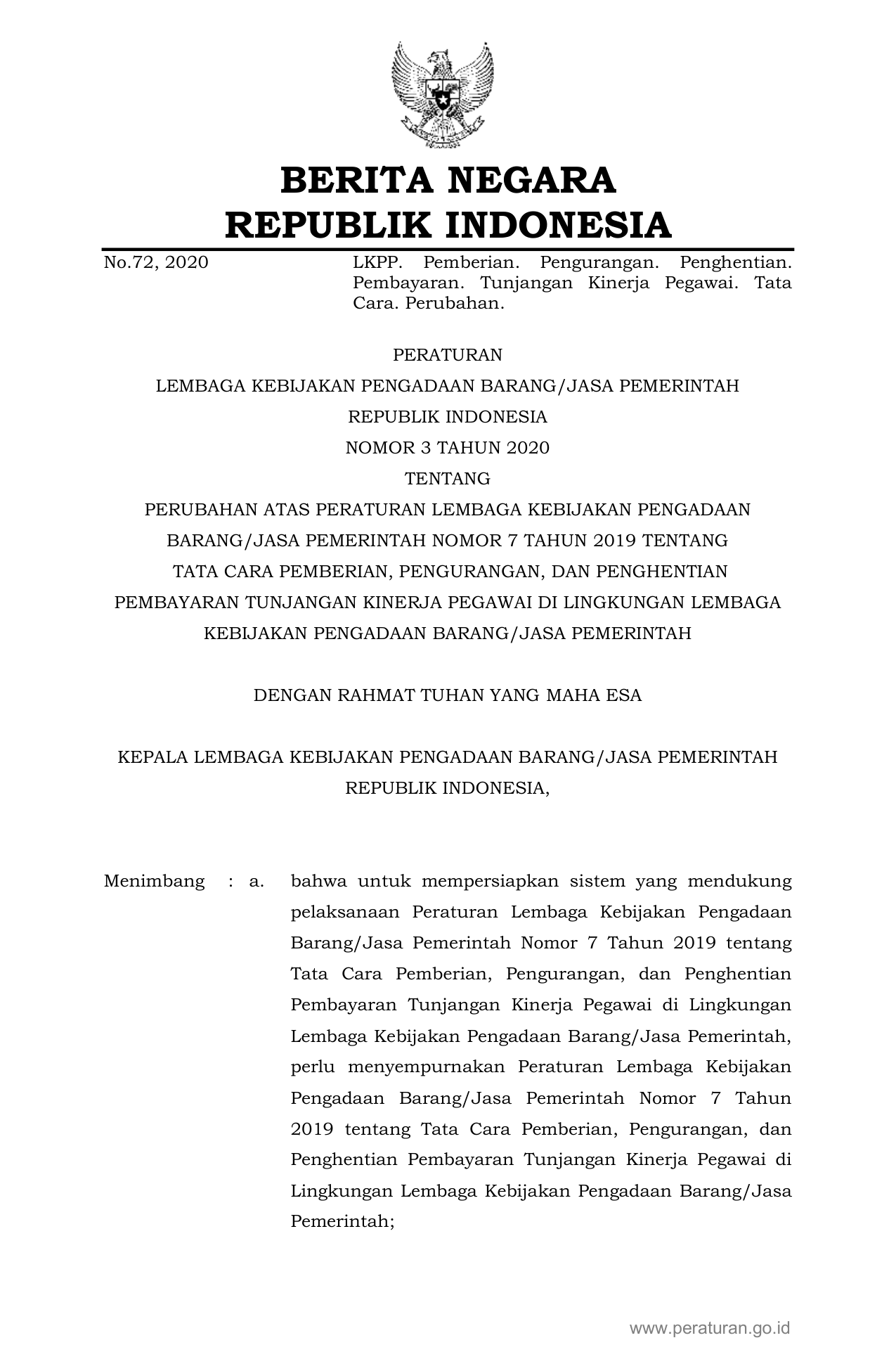 PERBAN Nomor 3 Tahun 2020 | Peraturan Badan Nomor 3 Tahun 2020 tentang PERUBAHAN ATAS PERATURAN LEMBAGA KEBIJAKAN PENGADAAN BARANG/JASA PEMERINTAH NOMOR 7 TAHUN 2019 TENTANG TATA CARA PEMBERIAN, PENGURANGAN, DAN PENGHENTIAN PEMBAYARAN TUNJANGAN KINERJA PEGAWAI DI LINGKUNGAN LEMBAGA KEBIJAKAN PENGADAAN BARANG/JASA PEMERINTAH
