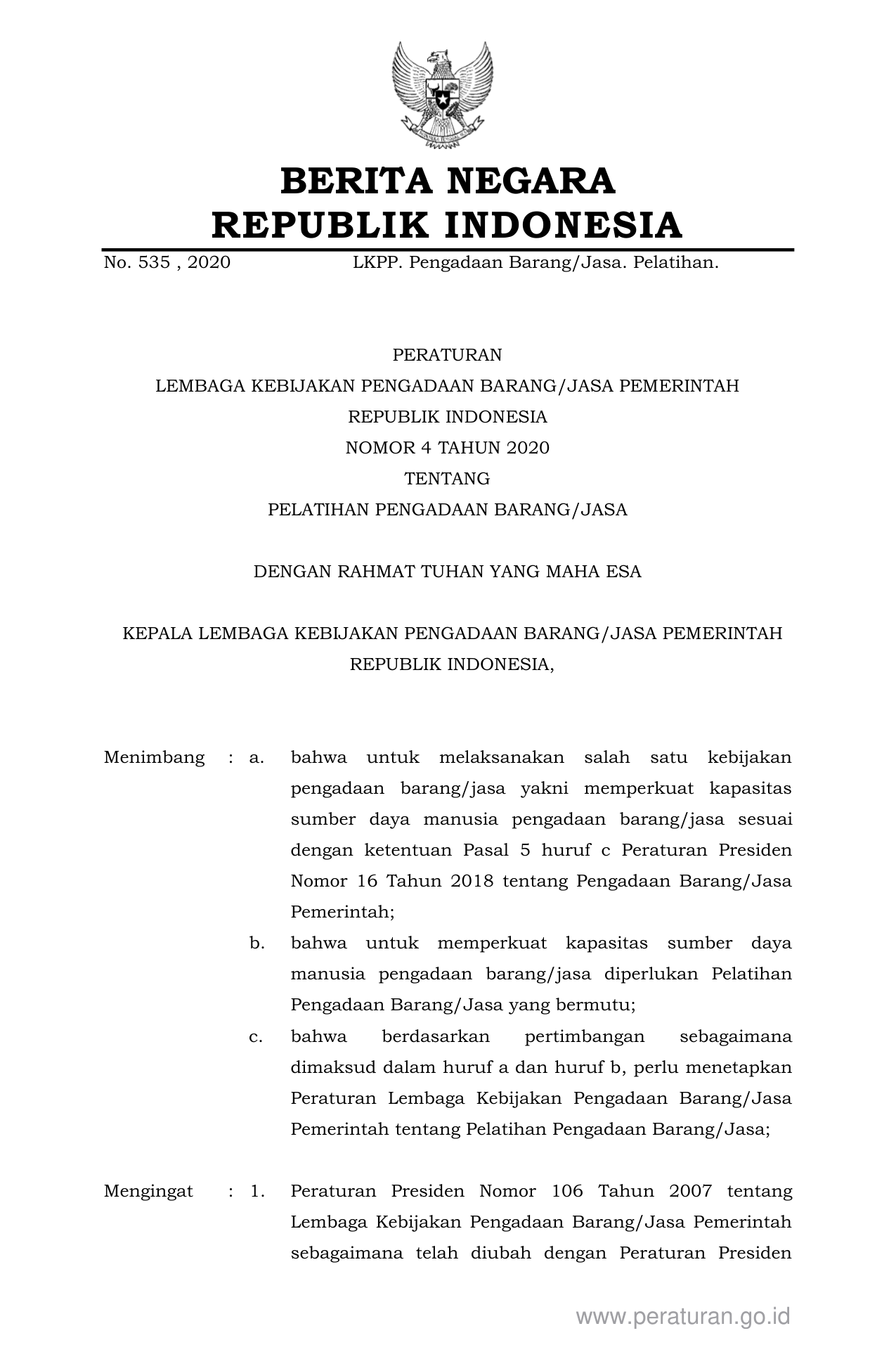 PERBAN Nomor 4 Tahun 2020 | Peraturan Badan Nomor 4 Tahun 2020 tentang PELATIHAN PENGADAAN BARANG/JASA