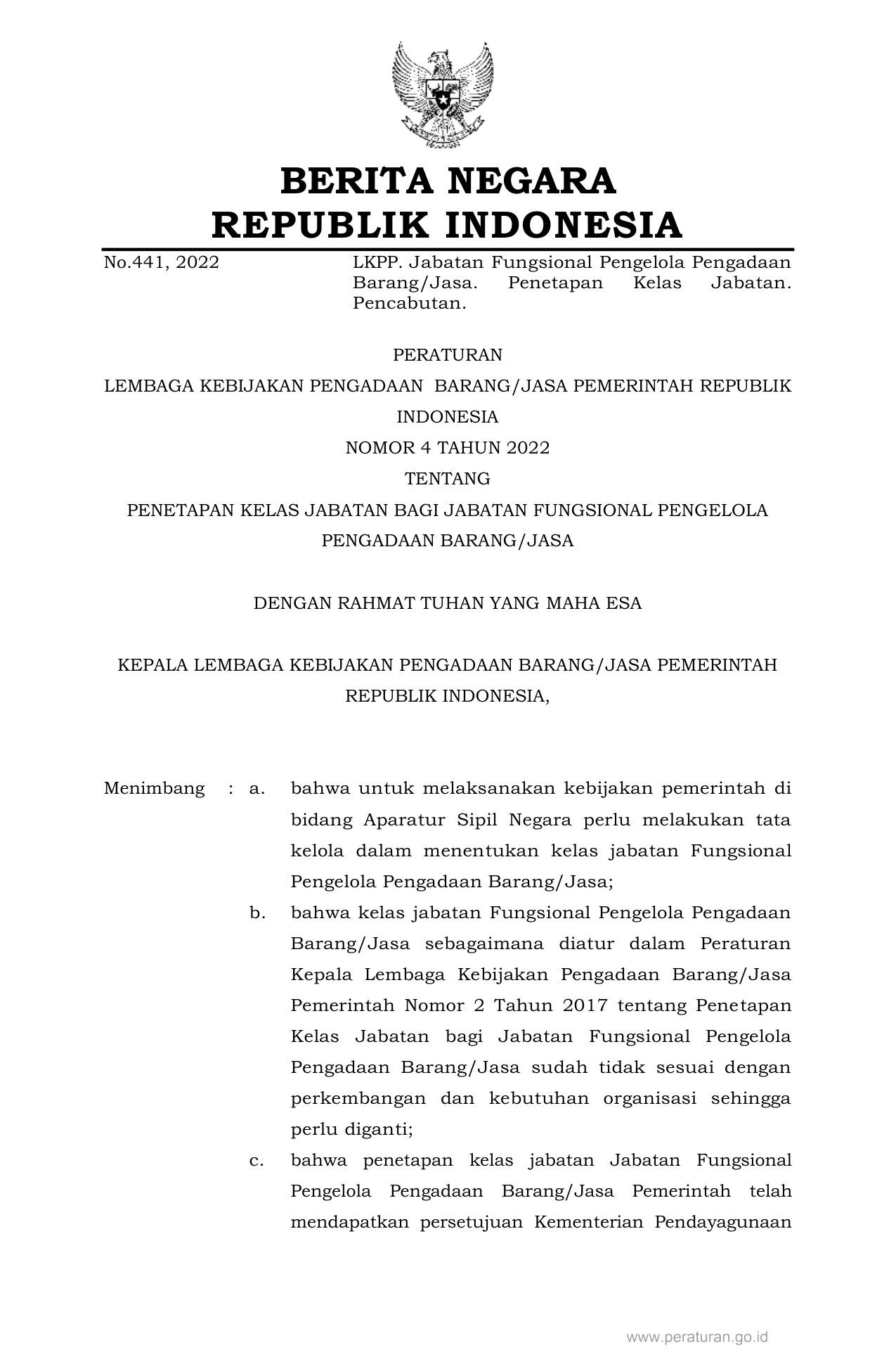 PERBAN Nomor 4 Tahun 2022 | Peraturan Badan Nomor 4 Tahun 2022 tentang PENETAPAN KELAS JABATAN BAGI JABATAN FUNGSIONAL PENGELOLA PENGADAAN BARANG/JASA