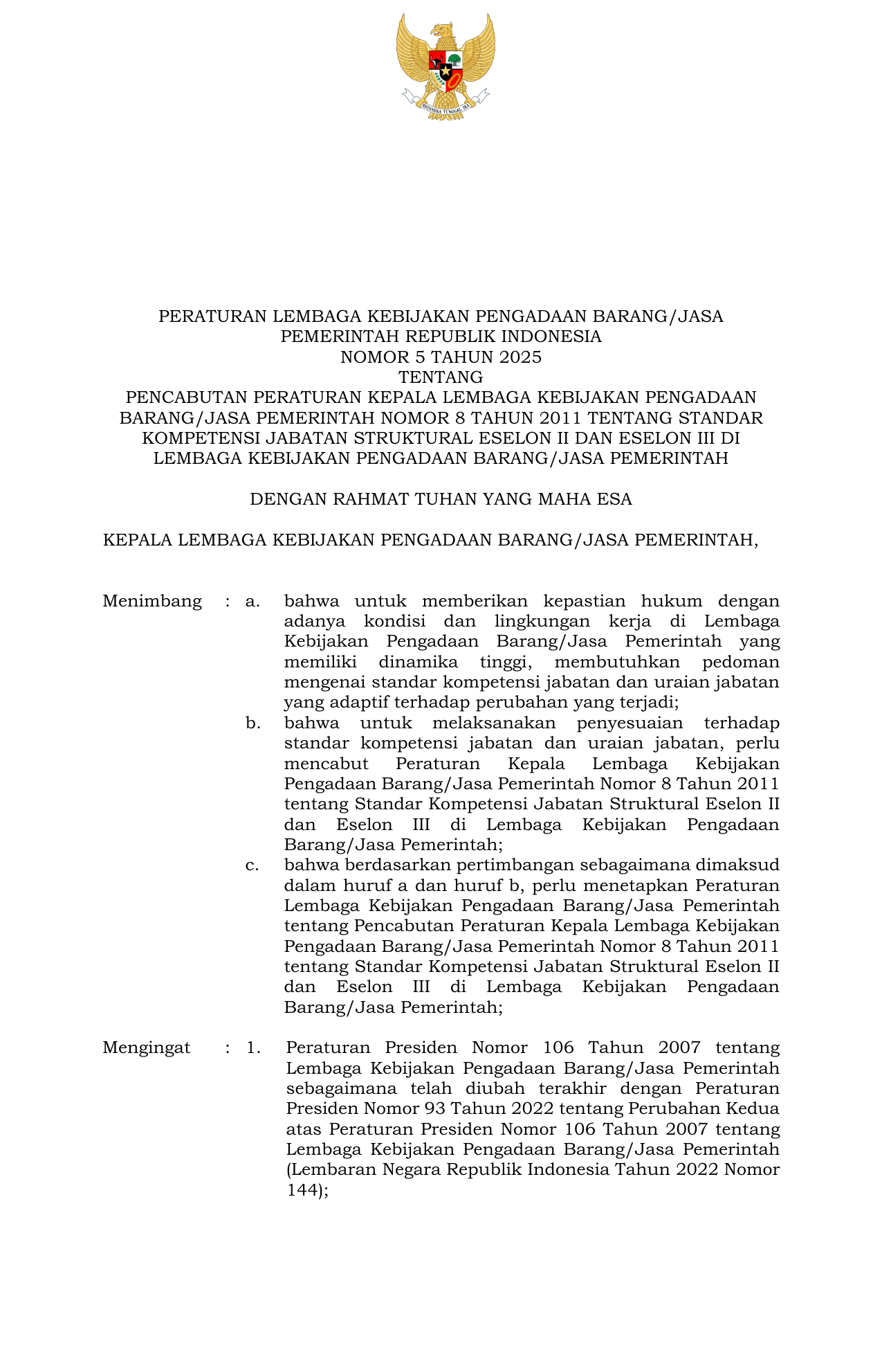 PERBAN Nomor 5 Tahun 2025 | Peraturan Badan Nomor 5 Tahun 2025 tentang PENCABUTAN PERATURAN KEPALA LEMBAGA KEBIJAKAN PENGADAAN BARANG JASA PEMERINTAH NOMOR 8 TAHUN 2011 TENTANG STANDAR KOMPETENSI JABATAN STRUKTURAL ESELON II DAN ESELON III DI LEMBAGA KEBIJAKAN PENGADAAN BARANG JASA PEMERINTAH