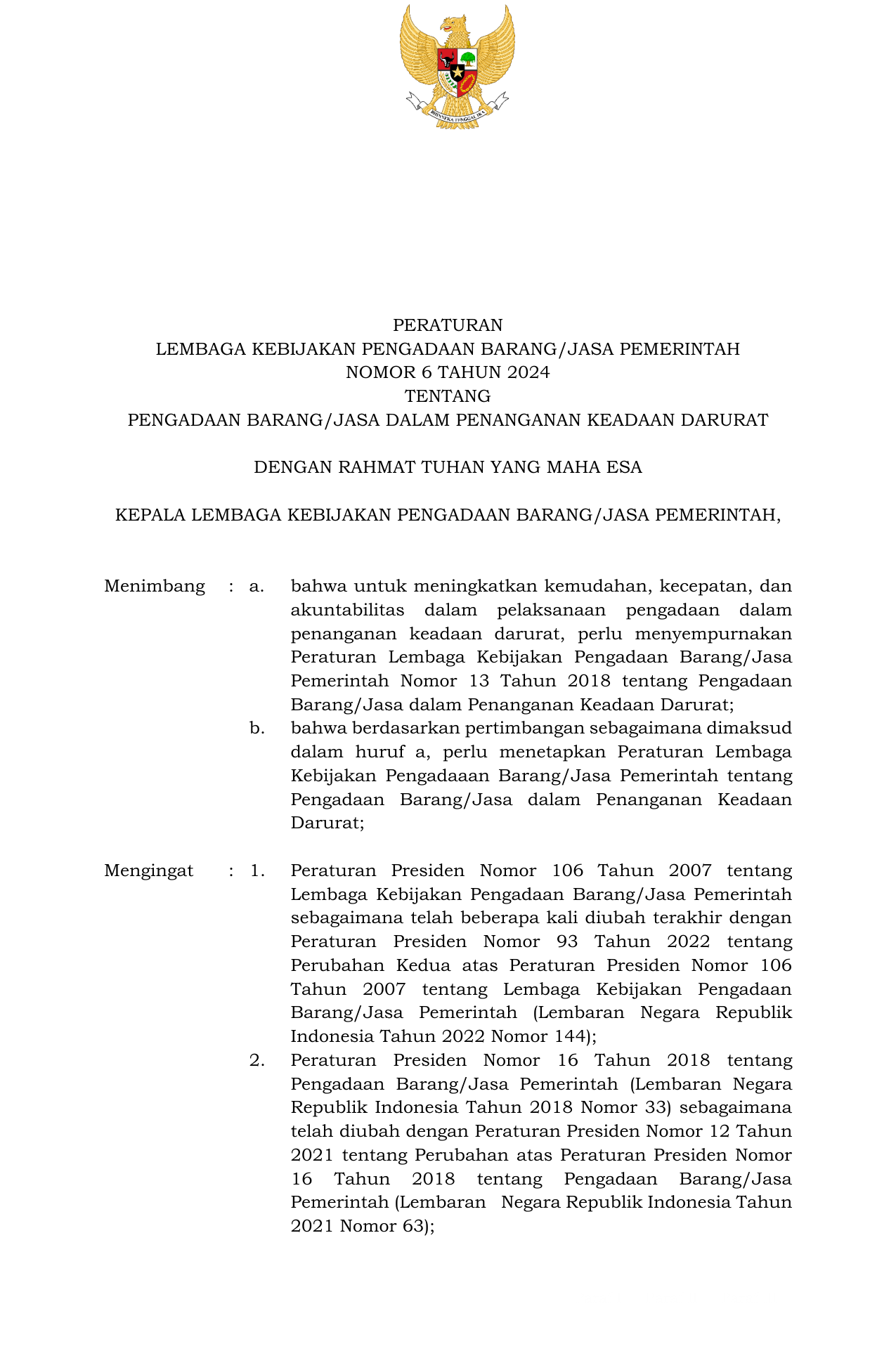 PERBAN Nomor 6 Tahun 2024 | Peraturan Badan Nomor 6 Tahun 2024 tentang Pengadaan Barang/Jasa dalam Penanganan Keadaan Darurat