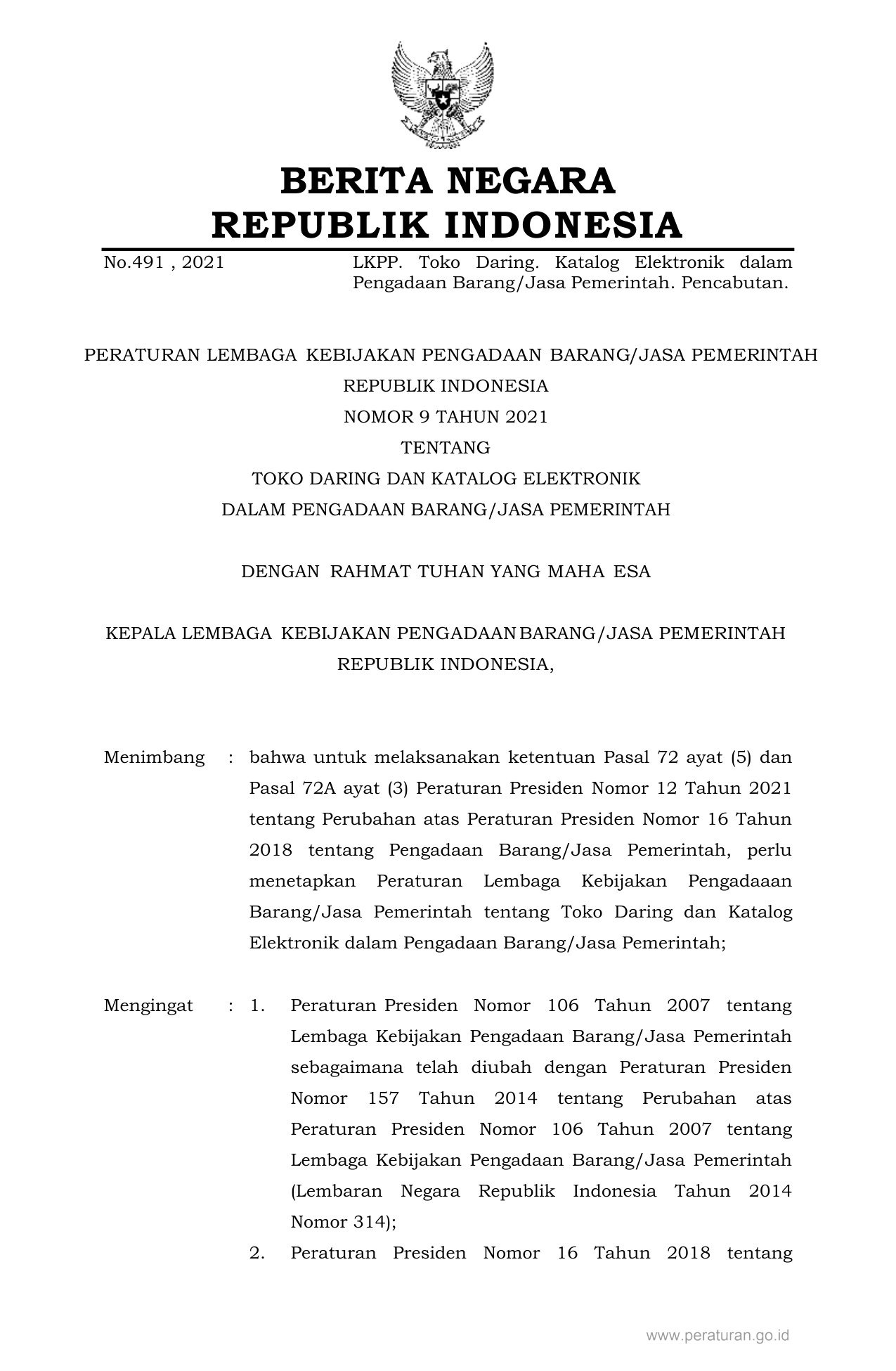 PERBAN Nomor 9 Tahun 2021 | Peraturan Badan Nomor 9 Tahun 2021 tentang TOKO DARING DAN KATALOG ELEKTRONIK DALAM PENGADAAN BARANG/JASA PEMERINTAH