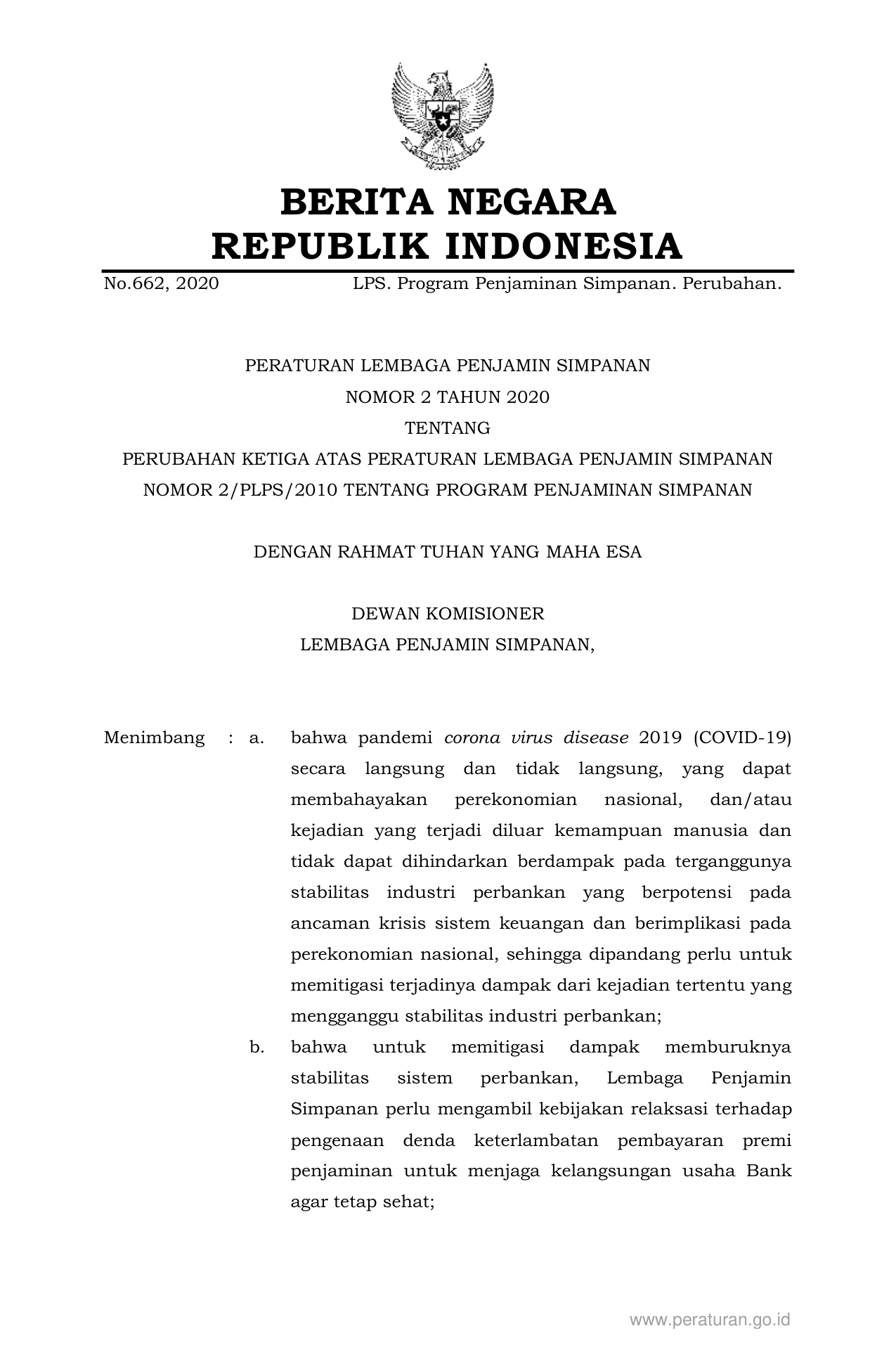 PERBAN Nomor 2 Tahun 2020 | Peraturan Badan Nomor 2 Tahun 2020 tentang PERUBAHAN KETIGA ATAS PERATURAN LEMBAGA PENJAMIN SIMPANAN NOMOR 2/PLPS/2010 TENTANG PROGRAM PENJAMINAN SIMPANAN