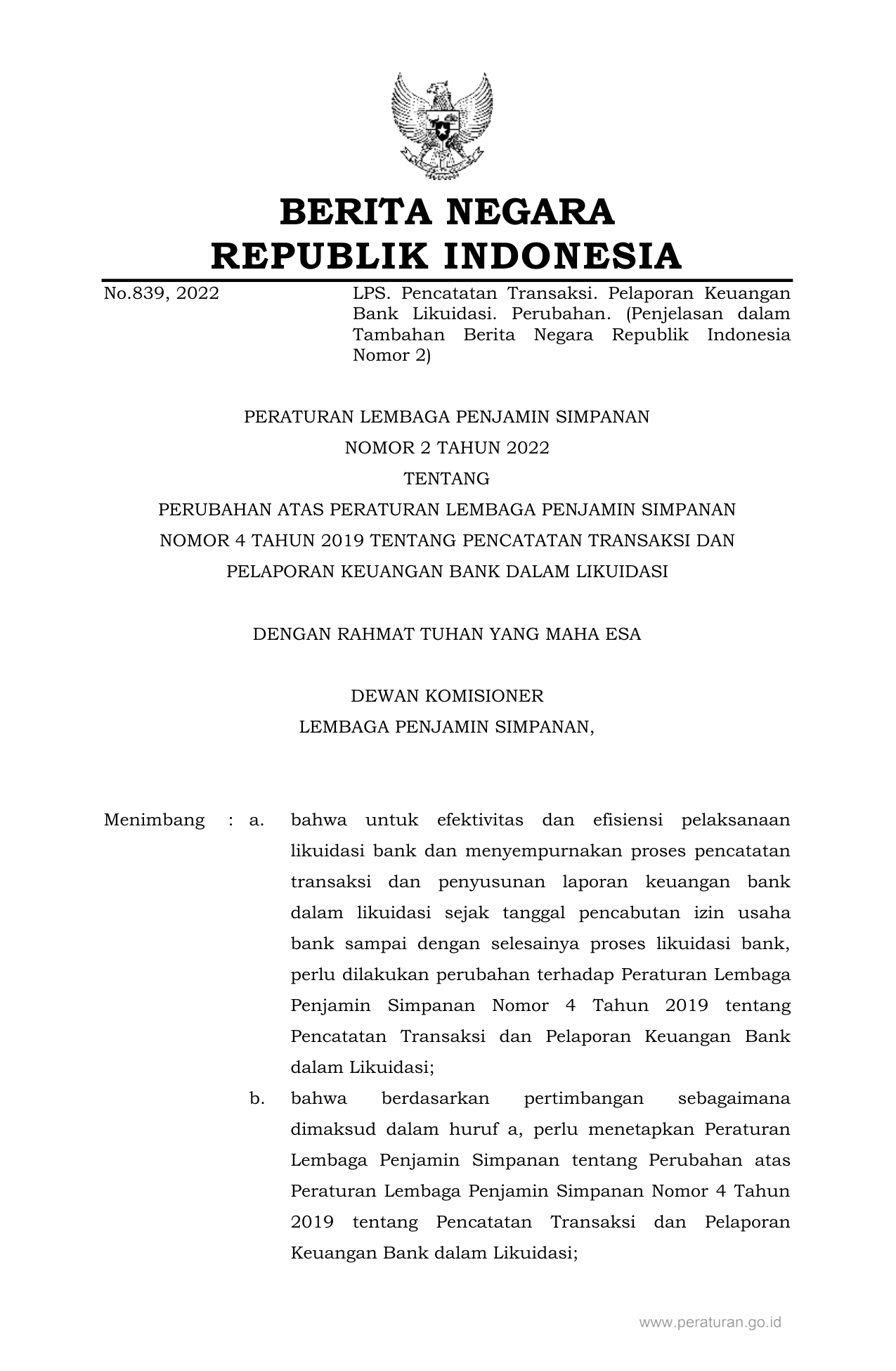 PERBAN Nomor 2 Tahun 2022 | Peraturan Badan Nomor 2 Tahun 2022 tentang PERUBAHAN ATAS PERATURAN LEMBAGA PENJAMIN SIMPANAN NOMOR 4 TAHUN 2019 TENTANG PENCATATAN TRANSAKSI DAN PELAPORAN KEUANGAN BANK DALAM LIKUIDASI