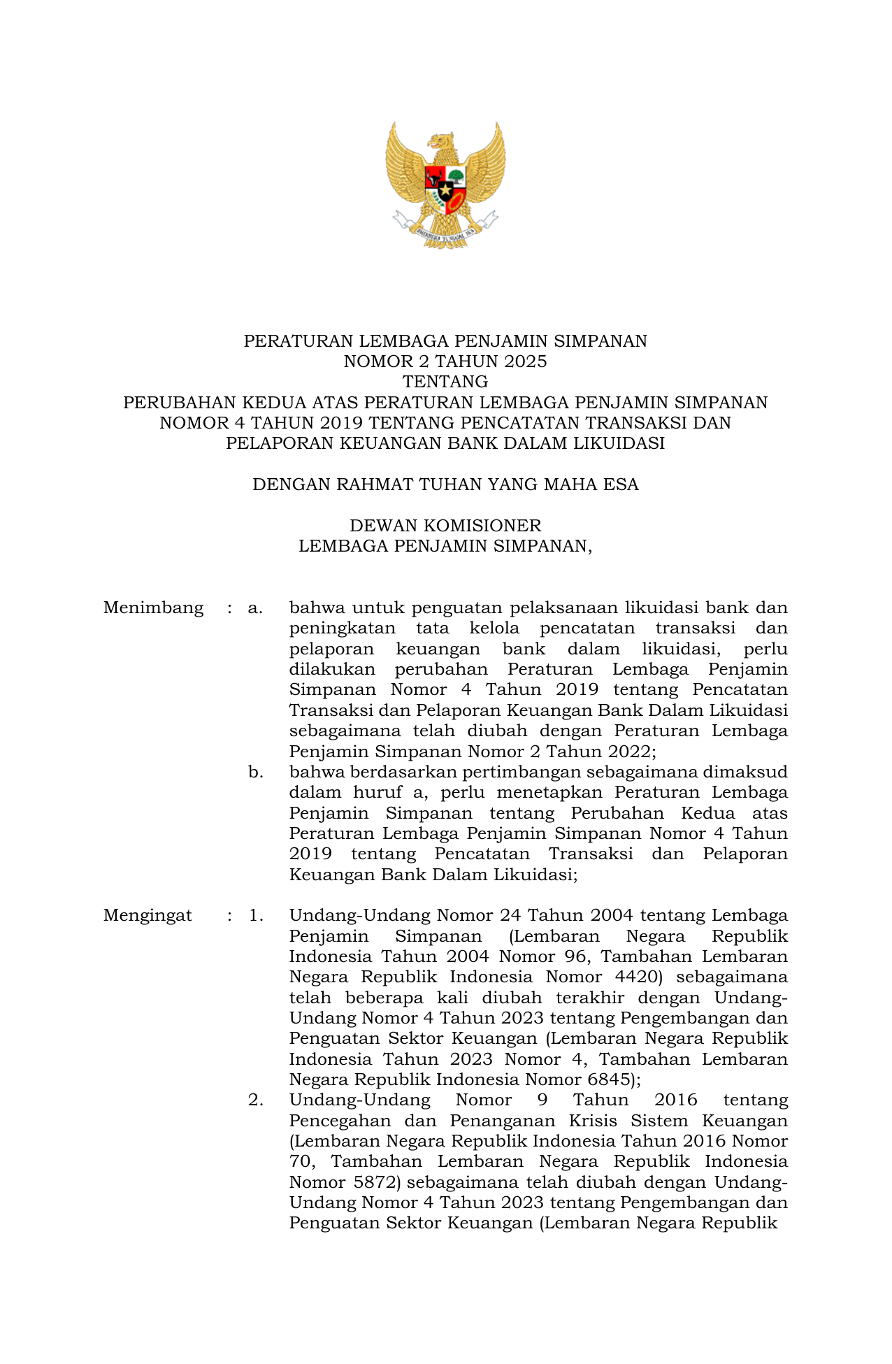 PERBAN Nomor 2 Tahun 2025 | Peraturan Badan Nomor 2 Tahun 2025 tentang Perubahan Kedua atas Peraturan Lembaga Penjamin Simpanan Nomor 4 Tahun 2019 tentang Pencatatan Transaksi dan Pelaporan Keuangan Bank Dalam Likuidasi