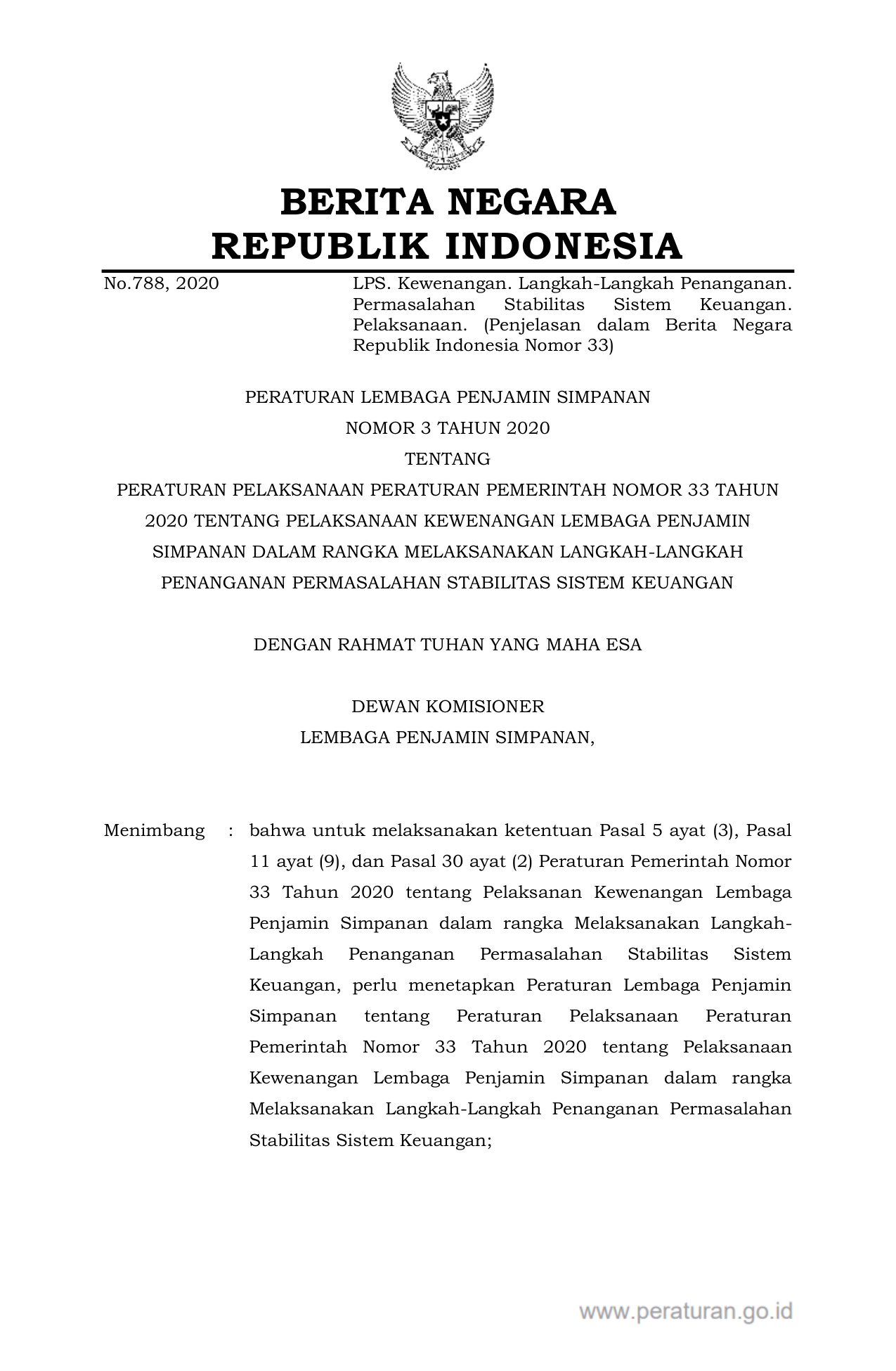 PERBAN Nomor 3 Tahun 2020 | Peraturan Badan Nomor 3 Tahun 2020 tentang PERATURAN PELAKSANAAN PERATURAN PEMERINTAH NOMOR 33 TAHUN 2020 TENTANG PELAKSANAAN KEWENANGAN LEMBAGA PENJAMIN SIMPANAN DALAM RANGKA MELAKSANAKAN LANGKAH-LANGKAH PENANGANAN PERMASALAHAN STABILITAS SISTEM KEUANGAN