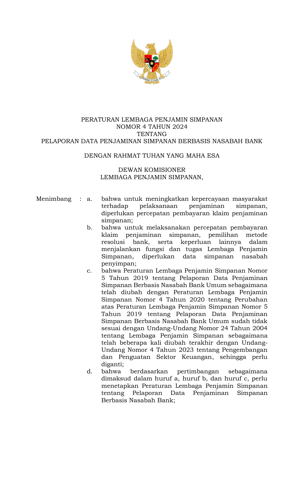 PERBAN Nomor 4 Tahun 2024 | Peraturan Badan Nomor 4 Tahun 2024 tentang Pelaporan Data Penjaminan Simpanan Berbasis Nasabah Bank