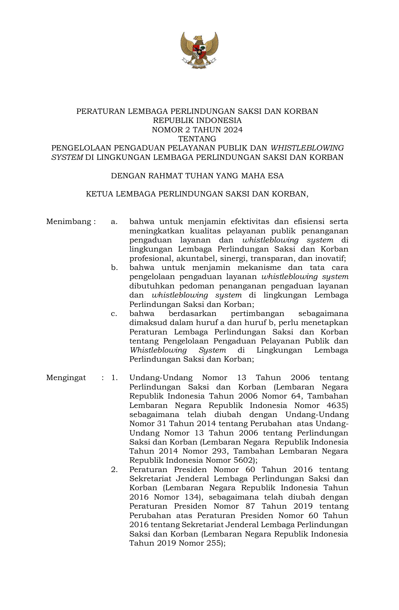 PERBAN Nomor 2 Tahun 2024 | Peraturan Badan Nomor 2 Tahun 2024 tentang PENGELOLAAN PENGADUAN PELAYANAN PUBLIK DAN WHISTLEBLOWING SYSTEM DI LINGKUNGAN LEMBAGA PERLINDUNGAN SAKSI DAN KORBAN