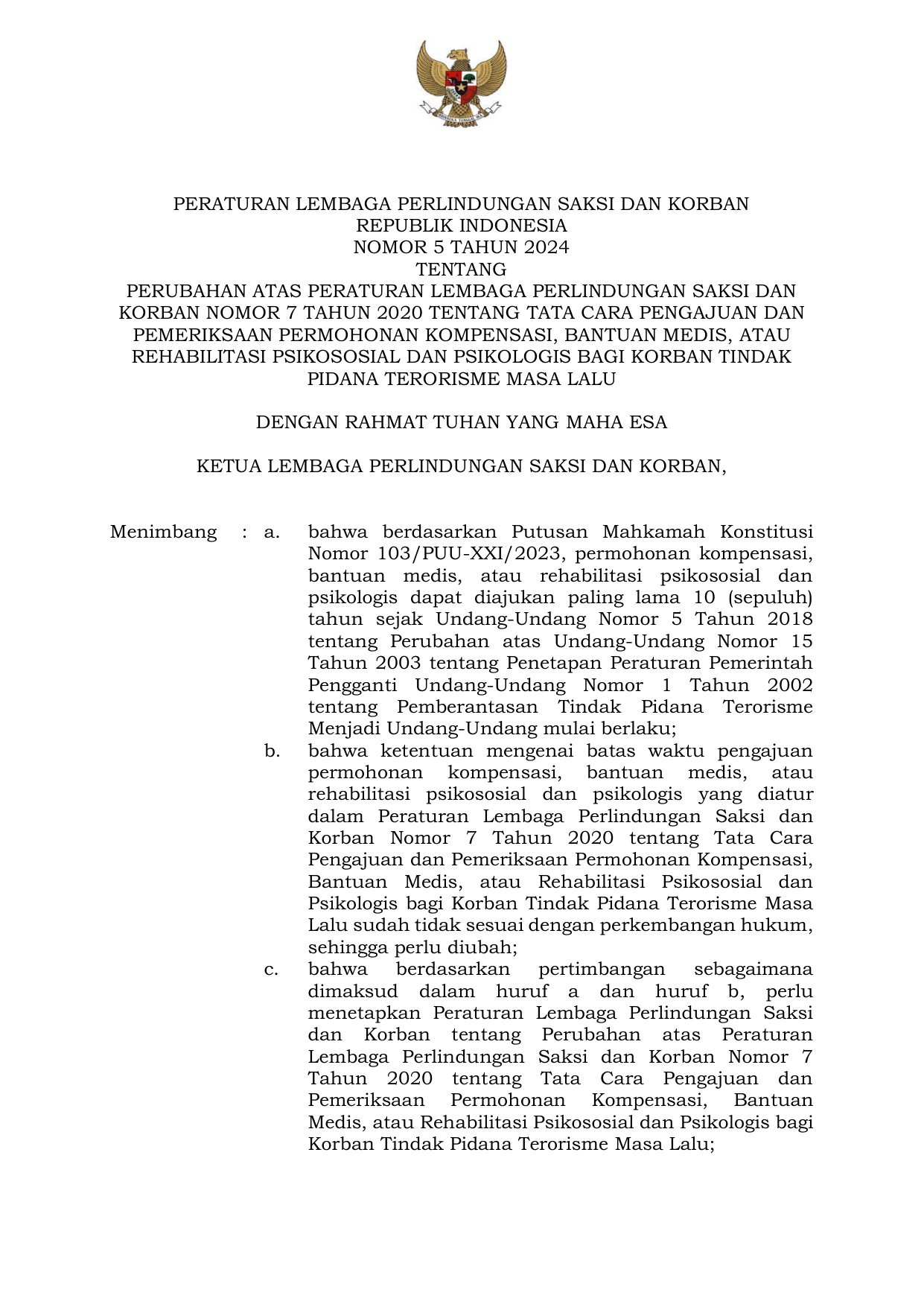 PERBAN Nomor 5 Tahun 2024 | Peraturan Badan Nomor 5 Tahun 2024 tentang Perubahan atas Peraturan Lembaga Perlindungan Saksi dan Korban Nomor 7 Tahun 2020 tentang Tata Cara Pengajuan dan Pemeriksaan Permohonan Kompensasi, Bantuan Medis, atau Rehabilitasi Psikososial dan Psikologis Bagi Korban Tindak Pidana Terorisme Masa Lalu
