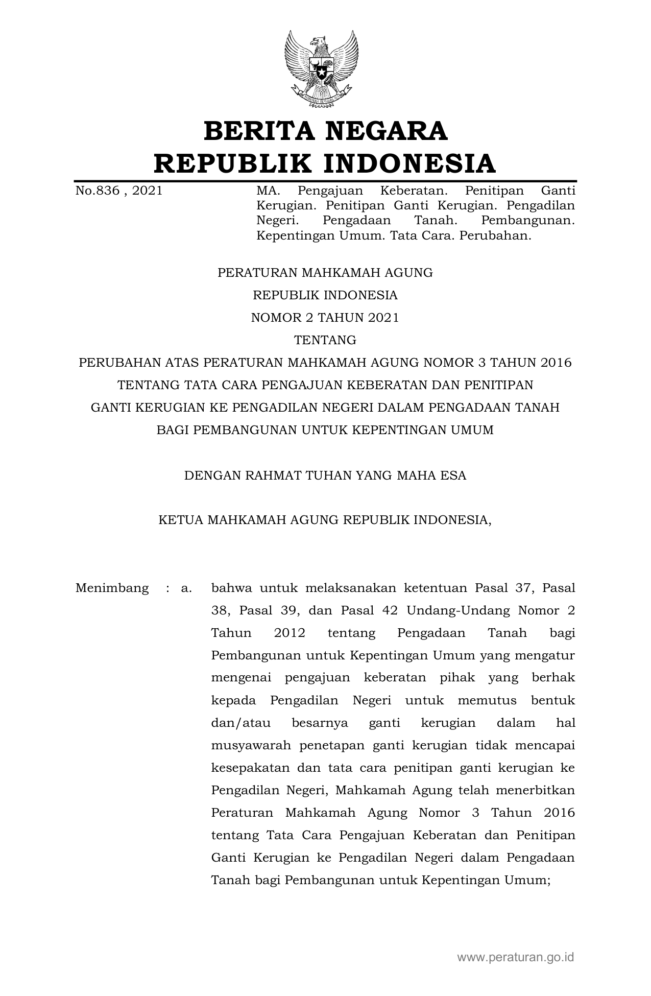 PERBAN Nomor 2 Tahun 2021 | Peraturan Badan Nomor 2 Tahun 2021 tentang PERUBAHAN ATAS PERATURAN MAHKAMAH AGUNG NOMOR 3 TAHUN 2016 TENTANG TATA CARA PENGAJUAN KEBERATAN DAN PENITIPAN GANTI KERUGIAN KE PENGADILAN NEGERI DALAM PENGADAAN TANAH BAGI PEMBANGUNAN UNTUK KEPENTINGAN UMUM