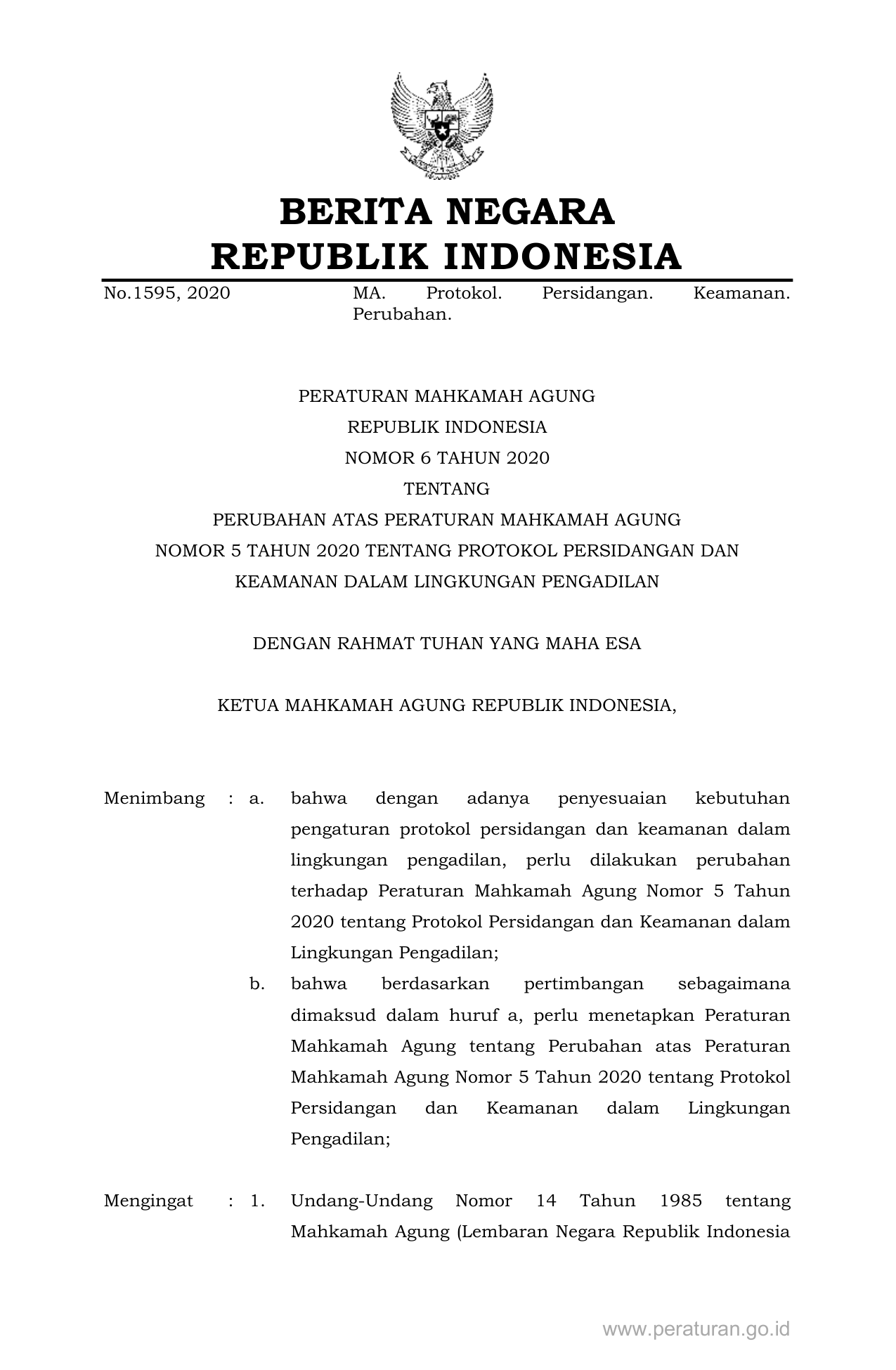 PERBAN Nomor 6 Tahun 2020 | Peraturan Badan Nomor 6 Tahun 2020 tentang PERUBAHAN ATAS PERATURAN MAHKAMAH AGUNG NOMOR 5 TAHUN 2020 TENTANG PROTOKOL PERSIDANGAN DAN KEAMANAN DALAM LINGKUNGAN PENGADILAN
