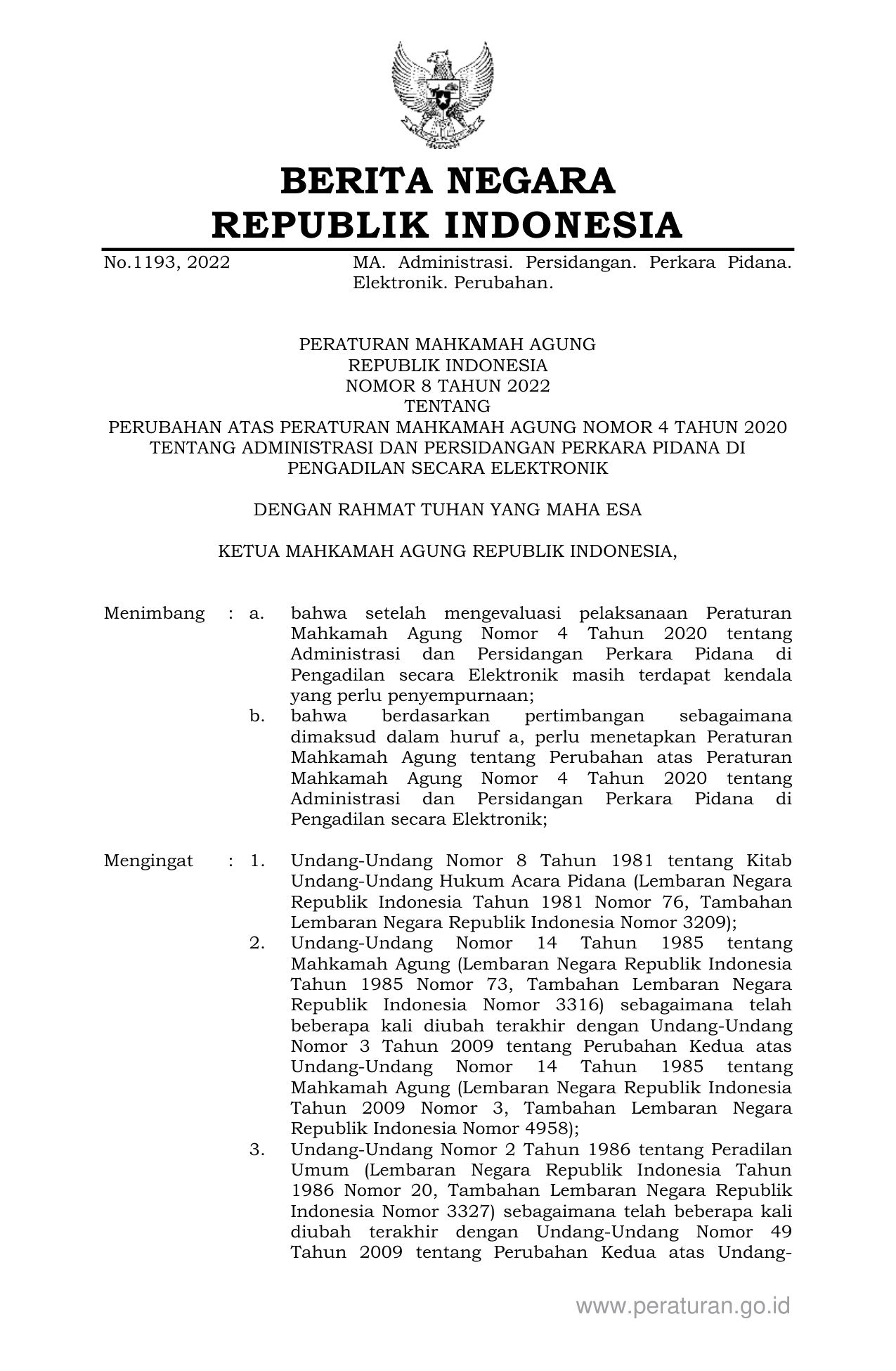PERBAN Nomor 8 Tahun 2022 | Peraturan Badan Nomor 8 Tahun 2022 tentang PERUBAHAN ATAS PERATURAN MAHKAMAH AGUNG NOMOR 4 TAHUN 2020 TENTANG ADMINISTRASI DAN PERSIDANGAN PERKARA PIDANA DI PENGADILAN SECARA ELEKTRONIK
