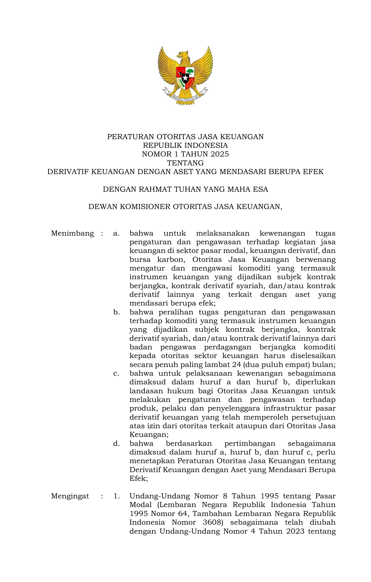 PERBAN Nomor 1 Tahun 2025 | Peraturan Badan Nomor 1 Tahun 2025 tentang Derivatif Keuangan dengan Aset yang Mendasari Berupa Efek