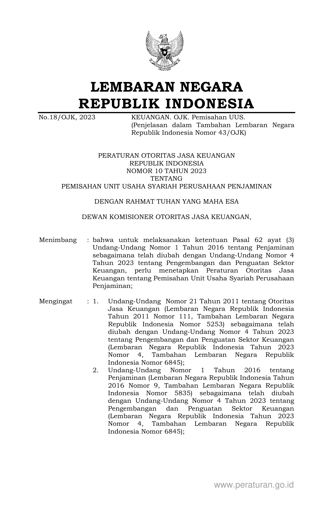 PERBAN Nomor 10 Tahun 2023 | Peraturan Badan Nomor 10 Tahun 2023 tentang PEMISAHAN UNIT USAHA SYARIAH PERUSAHAAN PENJAMINAN
