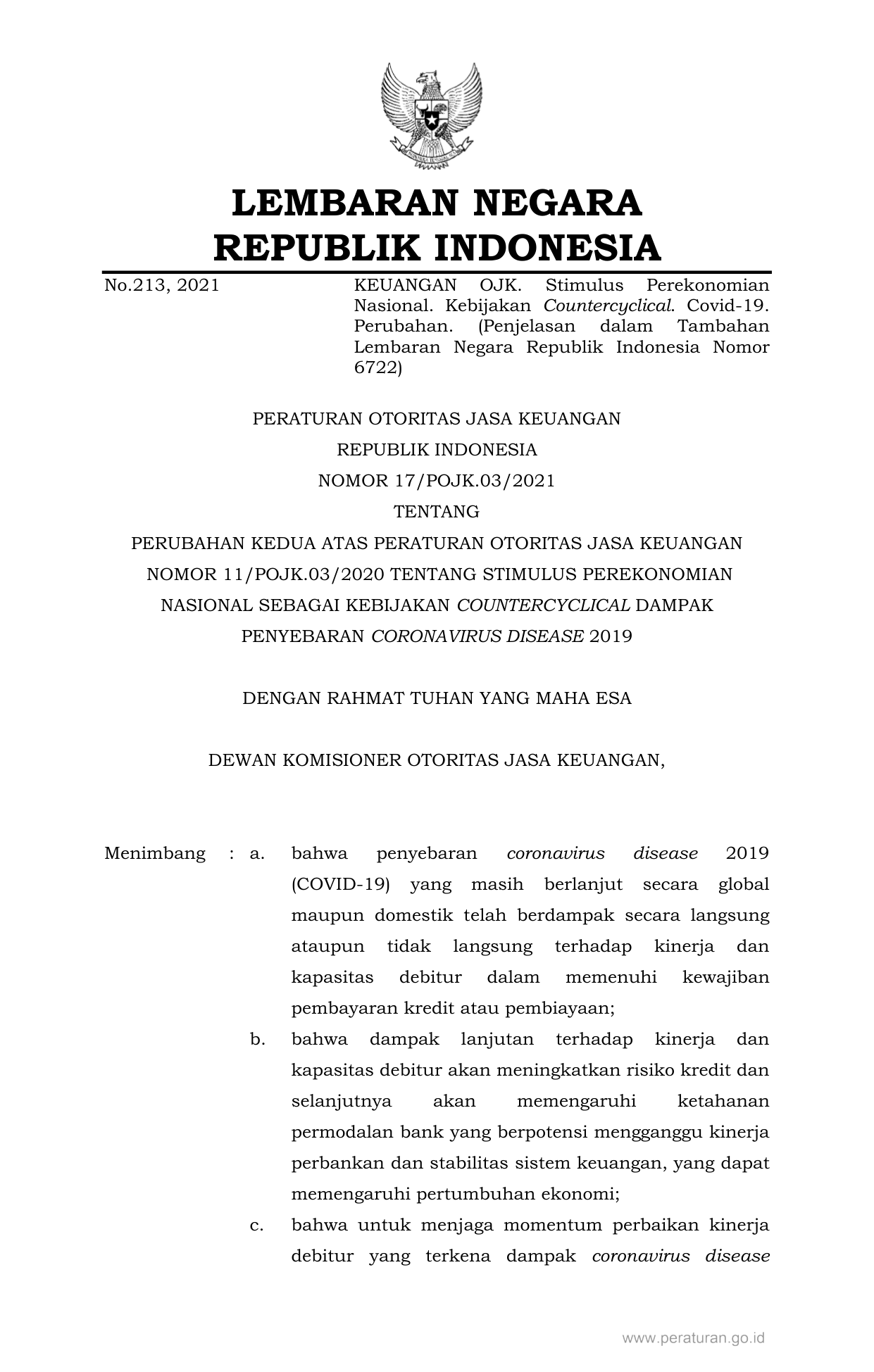 PERBAN Nomor 17-pojk-03-2021 Tahun 2021 | Peraturan Badan Nomor 17-pojk-03-2021 Tahun 2021 tentang PERUBAHAN KEDUA ATAS PERATURAN OTORITAS JASA KEUANGAN NOMOR 11/POJK.03/2020 TENTANG STIMULUS PEREKONOMIAN NASIONAL SEBAGAI KEBIJAKAN COUNTERCYCLICAL DAMPAK PENYEBARAN CORONAVIRUS DISEASE 2019