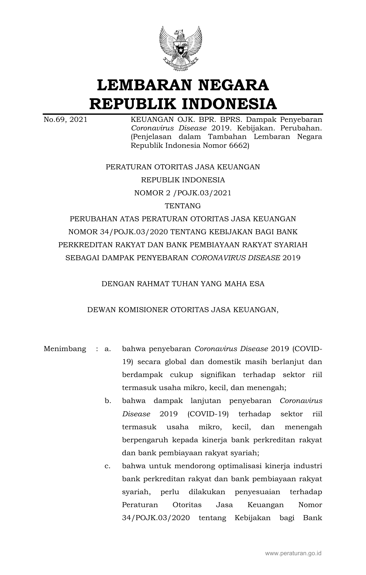 PERBAN Nomor 2-pojk-03-2021 Tahun 2021 | Peraturan Badan Nomor 2-pojk-03-2021 Tahun 2021 tentang PERUBAHAN ATAS PERATURAN OTORITAS JASA KEUANGAN NOMOR 34/POJK.03/2020 TENTANG KEBIJAKAN BAGI BANK PERKREDITAN RAKYAT DAN BANK PEMBIAYAAN RAKYAT SYARIAH SEBAGAI DAMPAK PENYEBARAN CORONAVIRUS DISEASE 2019