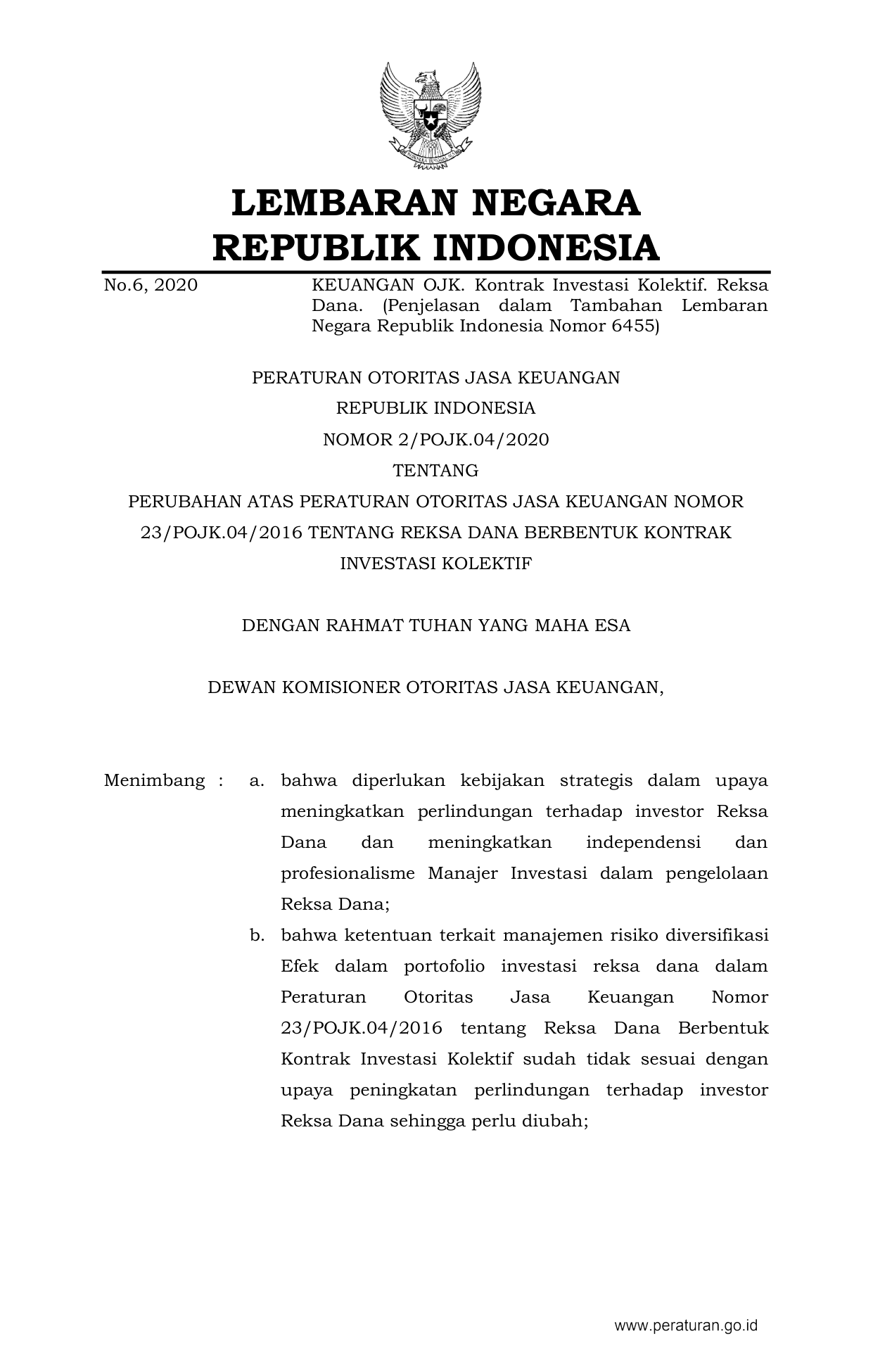 PERBAN Nomor 2-pojk-04-2020 Tahun 2020 | Peraturan Badan Nomor 2-pojk-04-2020 Tahun 2020 tentang PERUBAHAN ATAS PERATURAN OTORITAS JASA KEUANGAN NOMOR 23/POJK.04/2016 TENTANG REKSA DANA BERBENTUK KONTRAK INVESTASI KOLEKTIF