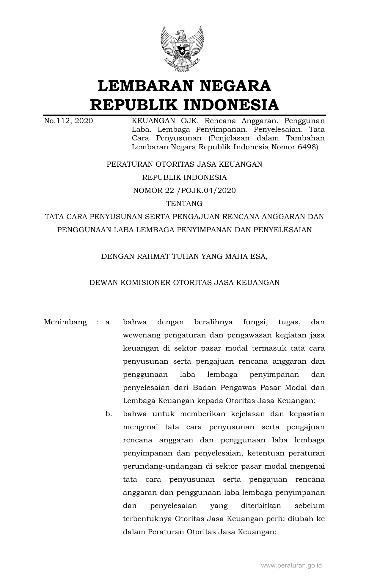 PERBAN Nomor 22-pojk-04-202 Tahun 2020 | Peraturan Badan Nomor 22-pojk-04-202 Tahun 2020 tentang TATA CARA PENYUSUNAN SERTA PENGAJUAN RENCANA ANGGARAN DAN PENGGUNAAN LABA LEMBAGA PENYIMPANAN DAN PENYELESAIAN