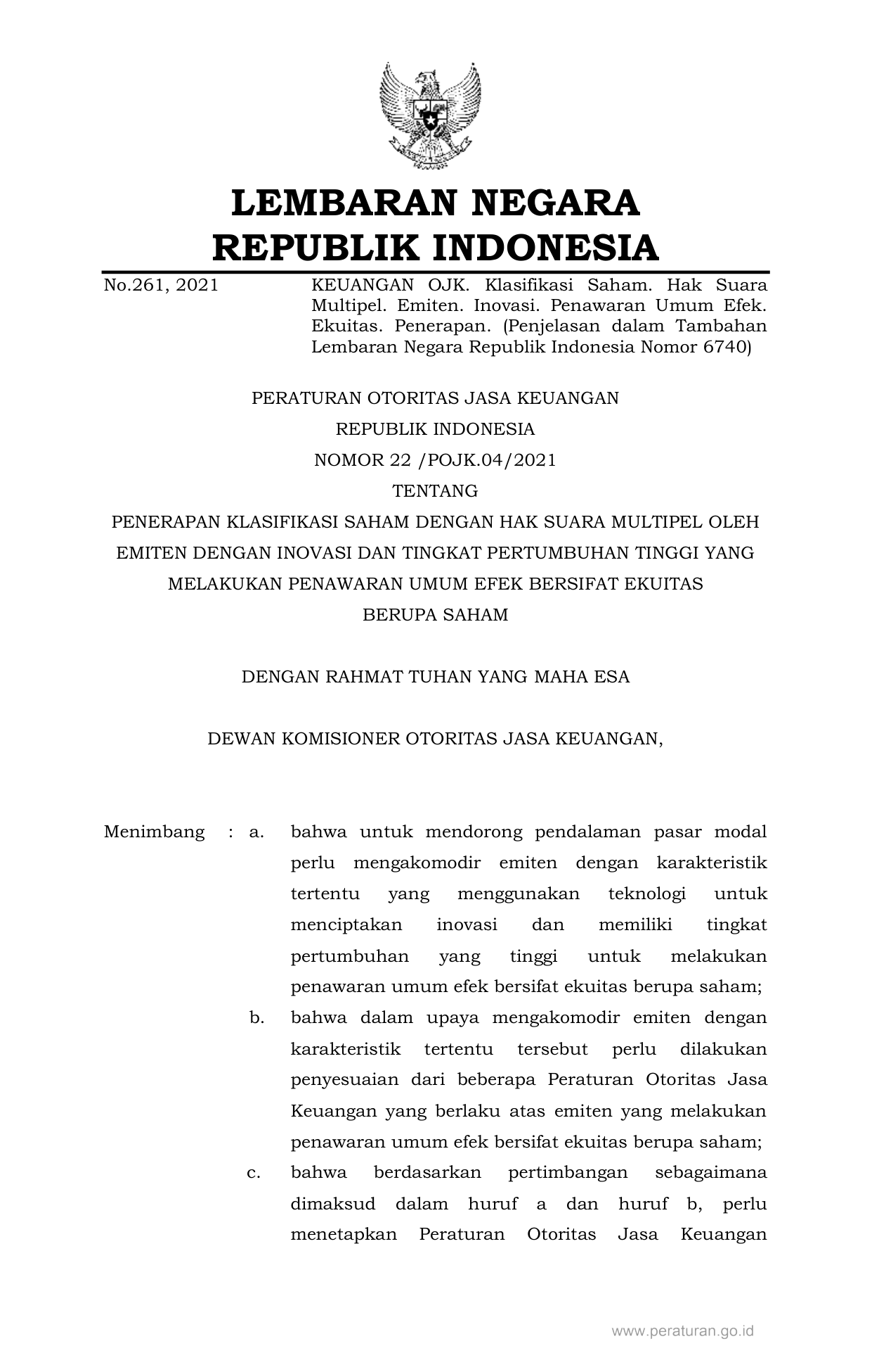 PERBAN Nomor 22-pojk-04-2021 Tahun 2021 | Peraturan Badan Nomor 22-pojk-04-2021 Tahun 2021 tentang PENERAPAN KLASIFIKASI SAHAM DENGAN HAK SUARA MULTIPEL OLEH EMITEN DENGAN INOVASI DAN TINGKAT PERTUMBUHAN TINGGI YANG MELAKUKAN PENAWARAN UMUM EFEK BERSIFAT EKUITAS BERUPA SAHAM
