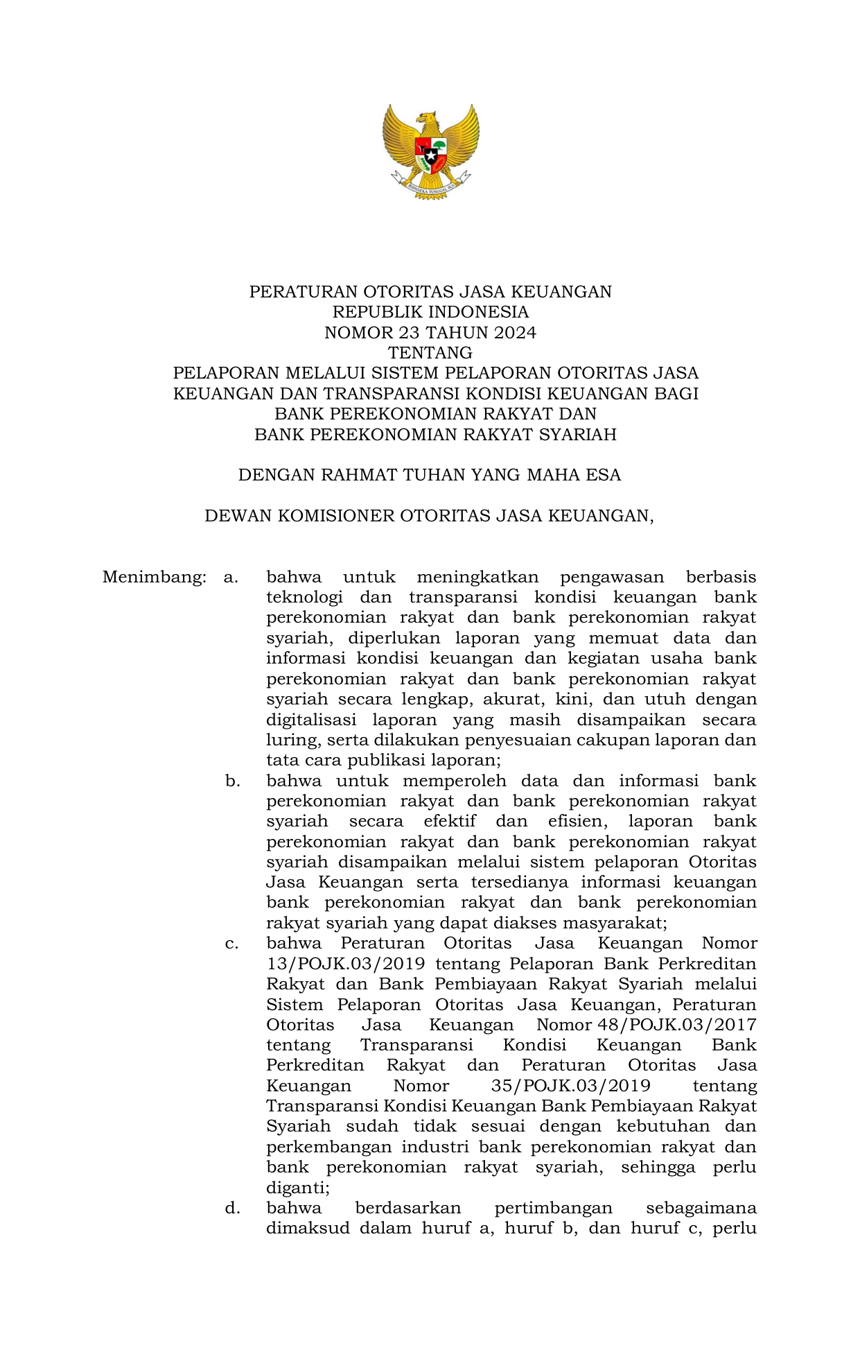 PERBAN Nomor 23 Tahun 2024 | Peraturan Badan Nomor 23 Tahun 2024 tentang Pelaporan Melalui Sistem Pelaporan Otoritas Jasa Keuangan dan Transparansi Kondisi Keuangan Bagi Bank Perekonomian Rakyat dan Bank Perekonomian Rakyat Syariah