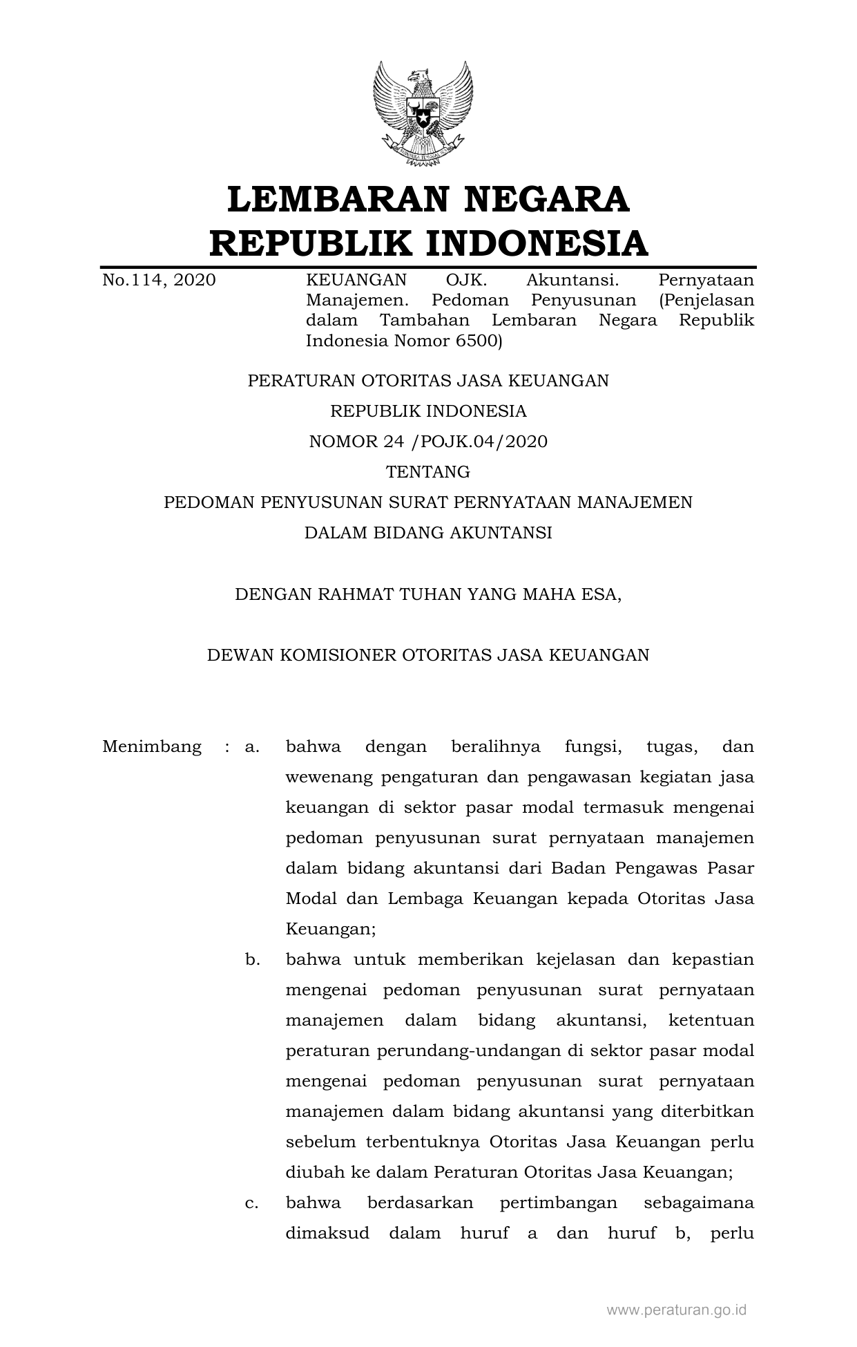 PERBAN Nomor 24-pojk-04-2020 Tahun 2020 | Peraturan Badan Nomor 24-pojk-04-2020 Tahun 2020 tentang PEDOMAN PENYUSUNAN SURAT PERNYATAAN MANAJEMEN DALAM BIDANG AKUNTANSI